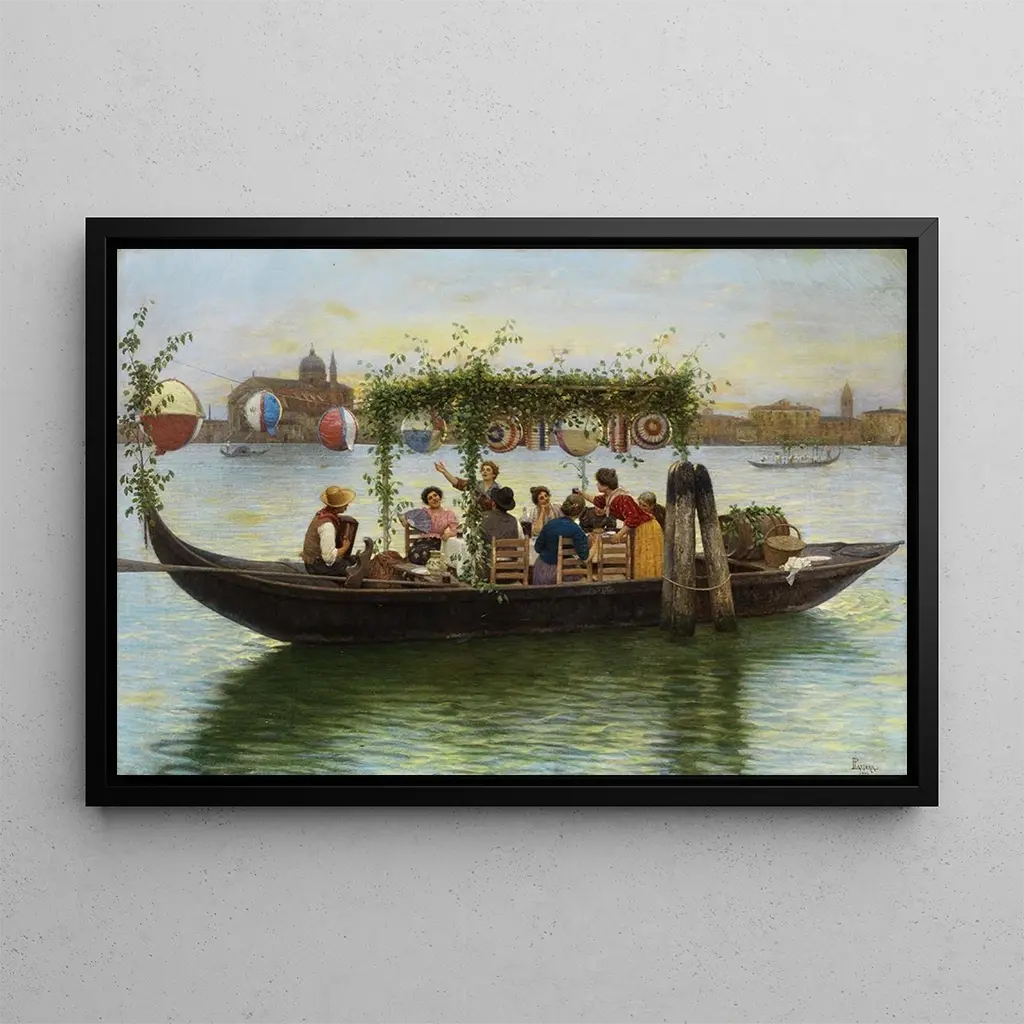 En la fiesta del Redentor: una celebración vibrante de la vida La obra "En la fiesta del Redentor" de Luigi Pastega nos sumerge en una atmósfera festiva y colorida, donde los personajes parecen bailar al ritmo de la alegría colectiva. Los colores vibrantes, que van desde rojos profundos hasta amarillos brillantes, crean un contraste impactante que atrae inmediatamente la mirada. La técnica del artista, combinando realismo y toques impresionistas, da vida a cada detalle, desde los rostros sonrientes hasta los pliegues de la ropa. Este lienzo evoca una escena de convivialidad, donde casi se puede escuchar el ruido de las risas y los cantos, invitando al espectador a compartir este momento de felicidad. Luigi Pastega: un maestro de la fiesta y de la emoción Luigi Pastega, pintor italiano de principios del siglo XX, es reconocido por su capacidad para capturar la esencia de las celebraciones populares. Influenciado por el movimiento impresionista, supo integrar elementos de la cultura italiana en sus obras, haciendo de cada cuadro una ventana a la vida cotidiana de su época. Su estilo, vibrante y lleno de colores, refleja un período en el que el arte buscaba expresar emociones auténticas y celebrar los momentos simples de la vida. Pastega logró hacerse un nombre gracias a sus representaciones de fiestas tradicionales, convirtiéndose así en una figura imprescindible del arte popular. Una adquisición decorativa con múltiples ventajas La impresión artística "En la fiesta del Redentor" es un lienzo que aportará un toque de alegría a su interior, ya sea en una sala de estar, una oficina o un dormitorio. Su calidad de impresión garantiza fidelidad en los colores y detalles de la obra original, permitiendo disfrutar plenamente de la energía que transmite. Al elegir esta obra, opta por un cuadro que no solo embellece su espacio, sino que también cuenta una historia, la de la alegría de vivir y las tradiciones. Su atractivo estético la convierte en una opción ideal para quienes desean enriquecer su decoración con una pieza llena de vida.