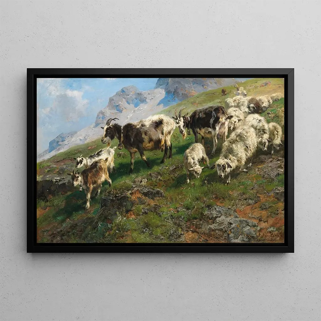 L'œuvre "Almabtrieb" d'Anton Braith dépeint une scène bucolique où des vaches sont conduites vers les alpages, symbolisant la tradition alpine. Les couleurs chaudes et terreuses, mêlées à des touches de vert éclatant, créent une atmosphère apaisante et joyeuse. La technique de Braith, qui allie réalisme et romantisme, permet de ressentir la douceur de la nature et l'harmonie entre l'homme et l'animal. Chaque détail, des expressions des vaches aux paysages environnants, est soigneusement rendu, invitant le spectateur à s'immerger dans ce moment de tranquillité.