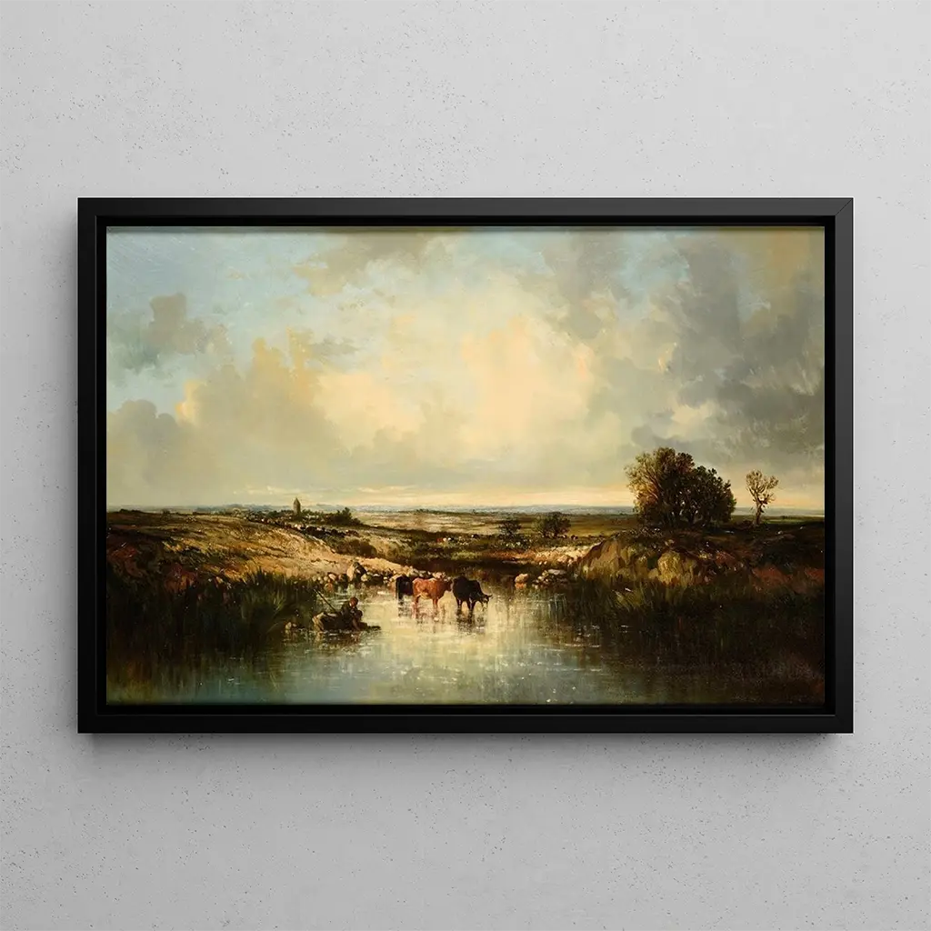 Animales en la lavandería : una escena de vida bucólica En esta impresión artística de Animales en la lavandería, Léon Victor Dupré captura un momento pacífico de la vida rural. La tela representa animales bebiendo cerca de una lavandería, rodeados de una naturaleza exuberante. Los colores suaves y naturales, que van desde verdes brillantes hasta marrones cálidos, crean una atmósfera tranquila y acogedora. La técnica de Dupré, que combina hábilmente el realismo con un toque impresionista, permite sentir la frescura del agua y la tranquilidad del paisaje. Cada detalle, desde los reflejos en el agua hasta las texturas de los animales, contribuye a una inmersión total en esta escena campestre. Léon Victor Dupré : un maestro del paisaje rural Léon Victor Dupré, activo en el siglo XIX, es reconocido por sus paisajes que celebran la naturaleza y la vida cotidiana. Influenciado por el movimiento realista, se inscribe en una época donde el arte se orienta hacia representaciones más auténticas del mundo. Sus obras reflejan una profunda admiración por la ruralidad y las tradiciones campesinas. Dupré supo capturar la esencia de la vida en el campo, haciendo de sus cuadros ventanas abiertas a un pasado ya pasado. Su estilo, a la vez preciso y poético, lo convierte en una figura imprescindible del arte francés. Una adquisición decorativa con múltiples ventajas Esta impresión artística de Animales en la lavandería es una elección ideal para embellecer su interior, ya sea en una sala de estar, una oficina o un dormitorio. Su calidad de impresión y fidelidad a los colores originales hacen de ella una pieza de arte que atrae la mirada y suscita contemplación. Al integrar este cuadro en su decoración, aporta un toque de naturaleza y serenidad a su espacio. Su atractivo estético y su ambiente relajante la convierten en un elemento decorativo que sabrá seducir a sus invitados y enriquecer su entorno de vida.