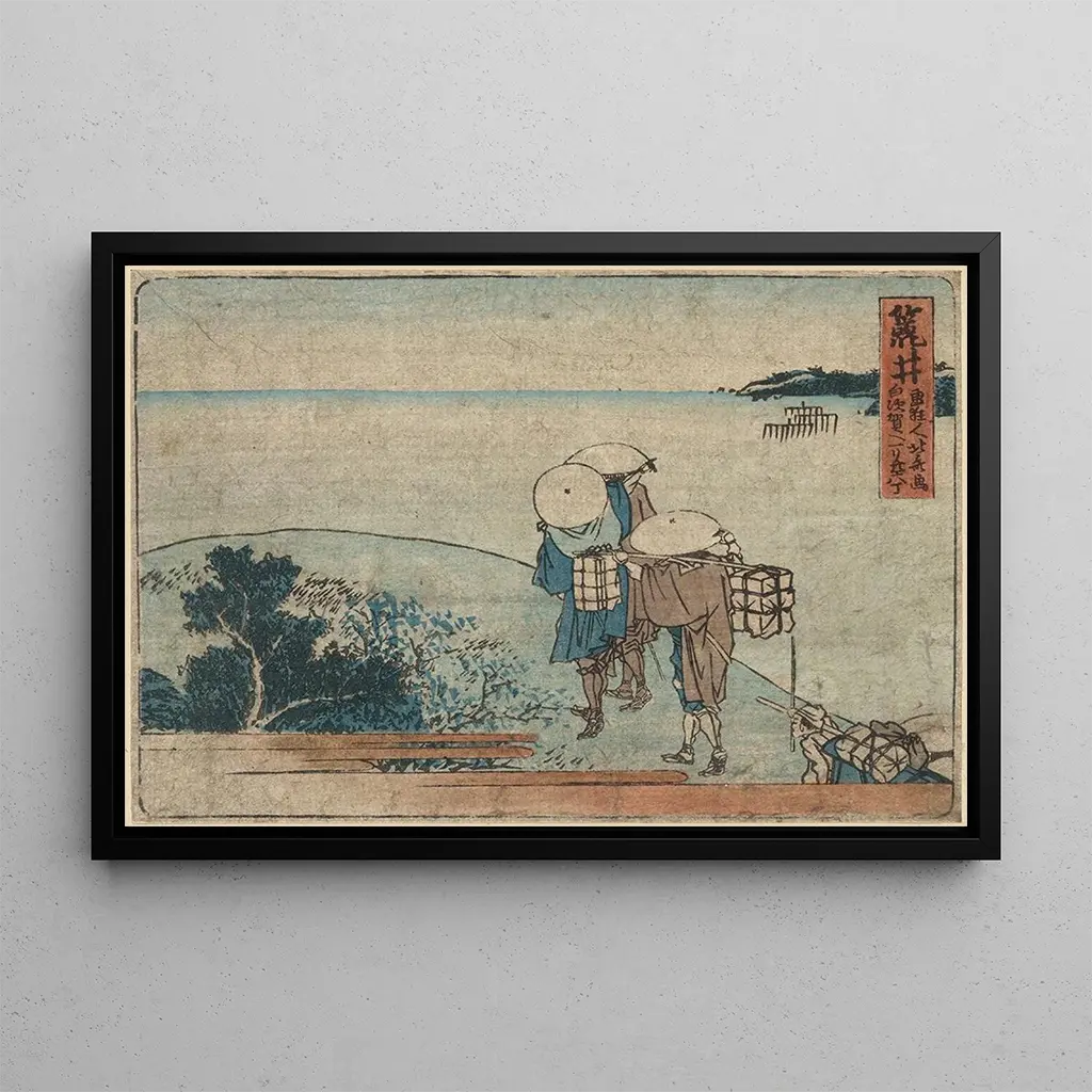 Arai, obra emblemática de Katsushika Hokusai, evoca un paisaje donde el mar y la montaña se encuentran en una armonía sorprendente. Los colores vivos, típicos de la impresión artística japonesa, crean una atmósfera a la vez serena y dinámica. Hokusai, maestro de la técnica ukiyo-e, utiliza líneas fluidas para capturar el movimiento de las olas, mientras que los matices de azul y verde aportan profundidad a la escena. Esta impresión artística de Arai invita a una contemplación meditativa, donde cada detalle parece contar una historia, un instante congelado en el tiempo.