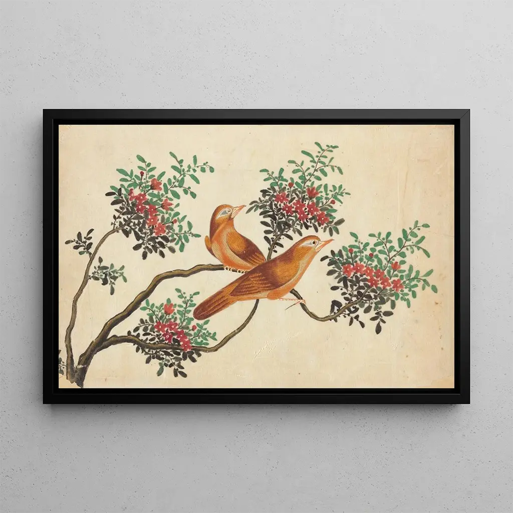 La impresión artística Oiseaux de China evoca un mundo encantador donde la naturaleza florece en una danza de colores vivos y formas delicadas. Los pájaros, representados con una precisión minuciosa, parecen cobrar vida en el lienzo, con sus plumajes brillantes iluminando el paisaje. Las tonalidades de azul, verde y rojo se mezclan armoniosamente, creando una atmósfera a la vez serena y vibrante. La técnica utilizada, probablemente de tinta sobre seda, confiere a la obra una ligereza y una fluidez que cautivan al observador. Cada detalle, desde el follaje exuberante hasta los pájaros gráciles, invita a una contemplación prolongada, revelando la belleza efímera de la naturaleza.