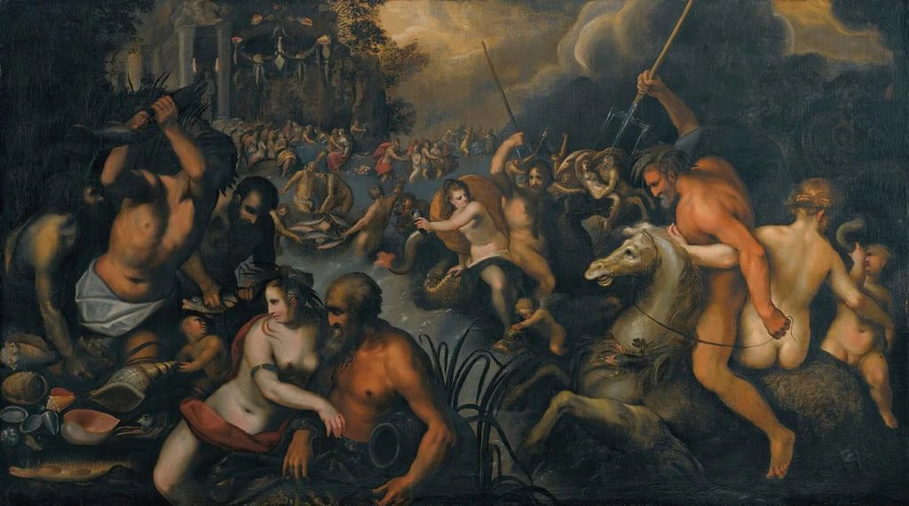 La Escuela veneciana, en el siglo XVII, es famosa por su estilo barroco llamativo y sus composiciones audaces. Los artistas de esa época, como Tiziano y Veronese, influyeron en la forma en que se representaban los relatos mitológicos, integrando elementos dramáticos y emocionales. "Bataille des dieux de la mer" se inscribe en esta tradición, reflejando la importancia de la mitología en el arte veneciano. Los artistas de esta escuela supieron capturar la grandeza y la belleza de los relatos antiguos, transformando temas clásicos en obras de una potencia visual inigualable.