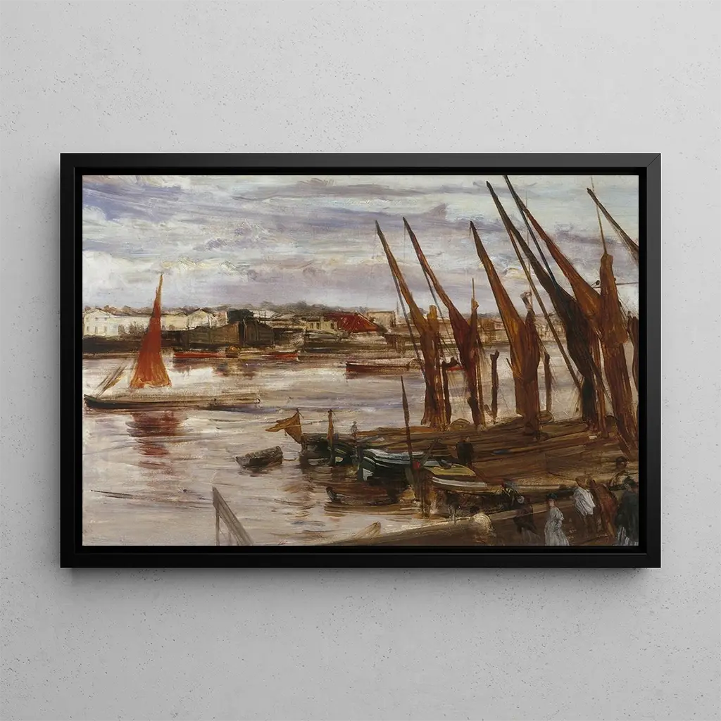 James Abbott McNeill Whistler, figure incontournable du mouvement impressionniste, a su marier la couleur et la lumière d'une manière inédite. Né en 1834 aux États-Unis, il s'installe à Paris où il s'imprègne des influences des artistes contemporains, tout en développant son propre style. Whistler est célèbre pour ses œuvres qui capturent des moments fugaces, souvent inspirés par la vie urbaine et la nature. Sa période de création, qui s'étend du milieu du XIXe siècle à ses dernières années, est marquée par une recherche constante de l'harmonie chromatique. Battersea Reach est un parfait exemple de son approche novatrice, où chaque coup de pinceau contribue à une expérience visuelle unique.