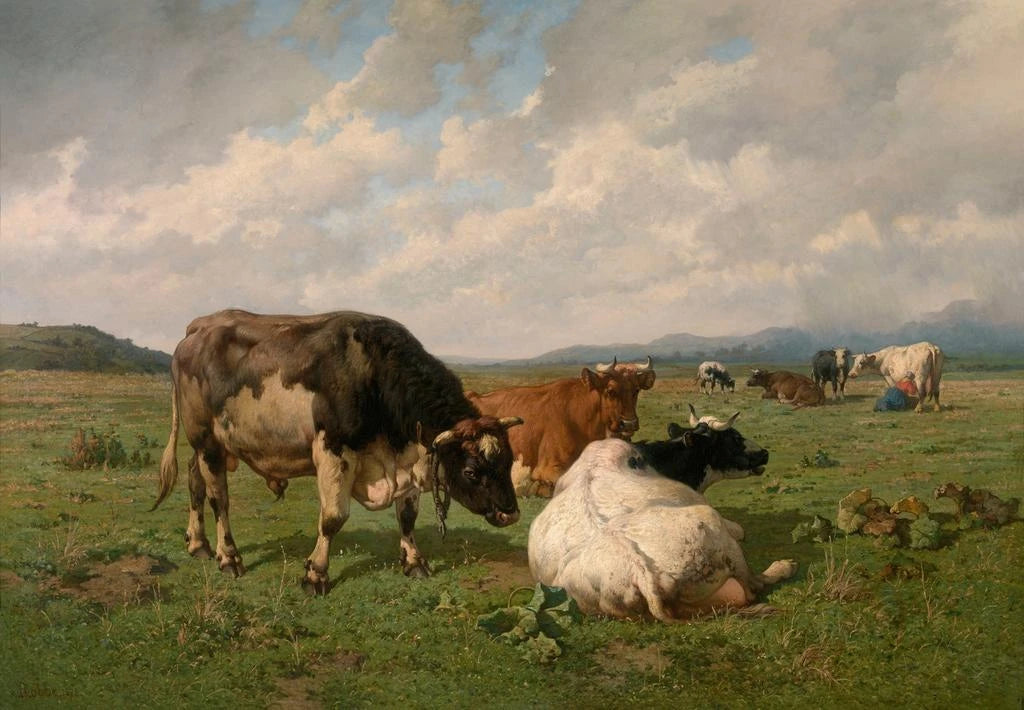 Dans cette reproduction de Bétail dans le pré, Louis Robbe nous transporte au cœur d'un paysage pastoral où la nature s'épanouit. Les teintes douces et lumineuses évoquent la lumière du jour, tandis que les animaux paisibles se mêlent harmonieusement à la verdure environnante. La technique de Robbe, qui allie réalisme et impressionnisme, crée une atmosphère apaisante, presque méditative. Chaque détail, des reflets dans l'eau aux ombres des arbres, contribue à une composition équilibrée qui invite à la contemplation et à l'évasion.