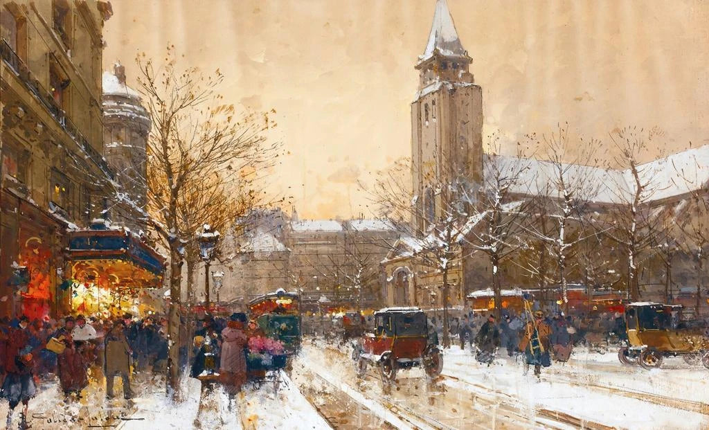 El cuadro "Boulevard Saint-Germain, París" de Eugène Galien-Laloue captura la esencia vibrante de la Belle Époque. En esta obra, los colores cálidos y luminosos se mezclan para crear una atmósfera animada, donde los transeúntes se desplazan con elegancia por el bulevar. La técnica del artista, que combina el realismo y el impresionismo, da vida a cada detalle, desde las sombras de los árboles hasta los reflejos de los adoquines mojados. La composición, cuidadosamente equilibrada, invita al espectador a sumergirse en esta escena parisina, donde el encanto de la ciudad se revela en cada mirada.