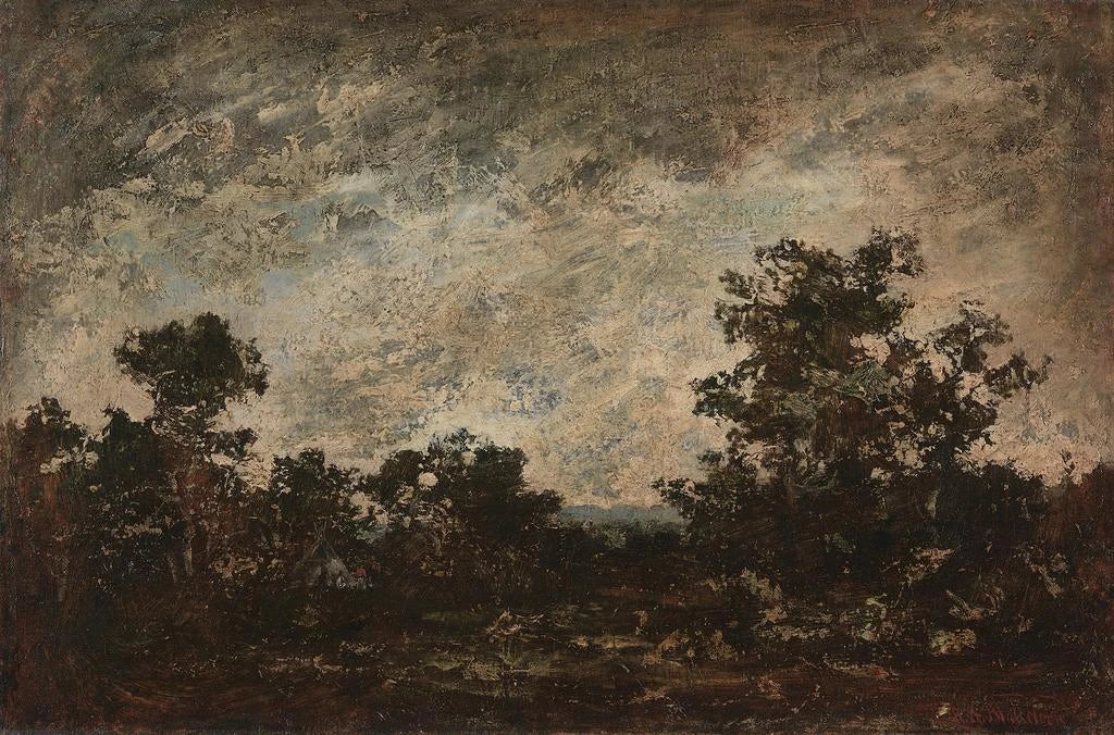 "Camp Indien" de Ralph Albert Blakelock nos sumerge en un paisaje natural donde reina la tranquilidad. Esta obra evoca una escena de camping junto a un lago, rodeado de majosas montañas y un bosque denso. Los colores ricos y terrosos, que van desde verdes profundos hasta marrones cálidos, crean una atmósfera serena y contemplativa. La técnica de Blakelock, que utiliza golpes de pincel delicados para representar la luz filtrándose a través de los árboles, confiere una dimensión casi mística a esta impresión artística. La obra invita al espectador a perderse en la belleza de la naturaleza, a sentir la paz y la soledad que puede ofrecer.
