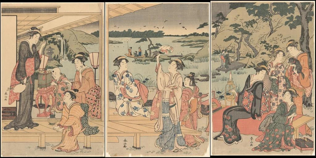 Katsukawa Shunzan, activo durante el período Edo (1603-1868), es reconocido por sus estampas que celebran la belleza de la vida cotidiana japonesa. Influenciado por los grandes maestros de su tiempo, supo desarrollar un estilo único, combinando tradición e innovación. Su trabajo se distingue por una atención especial a los detalles y una paleta de colores refinada. Como artista del ukiyo-e, contribuyó al auge de esta forma de arte popular, que logró capturar la esencia de la vida japonesa a través de escenas de paisajes, festivales y naturaleza. La impresión artística de Chasse aux lucioles au jardin Daimyo testimonia su talento indiscutible y su legado artístico.