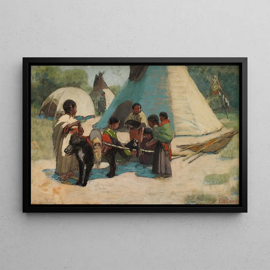 La reproduction de "Chien Travois Camp Blackfoot" nous plonge dans l'univers fascinant des peuples autochtones d'Amérique du Nord. Cette œuvre dépeint un chien attelé à un travois, symbole de la vie nomade des Blackfoot. Les couleurs terreuses et les textures riches évoquent la connexion profonde entre les animaux et les hommes dans cette culture. La scène, vibrante de vie, capture un moment de quotidien, où chaque détail raconte une histoire. La technique de l’artiste, alliant réalisme et touches stylisées, permet de ressentir l'âme de ce peuple et de son environnement.