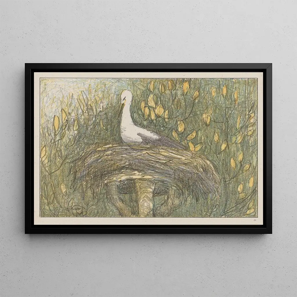 En "Cigüeña en el nido", Theo van Hoytema nos ofrece una escena llena de serenidad y dulzura. La tela representa una cigüeña majestuosa, posada en su nido, rodeada de una vegetación exuberante. Los colores suaves, que van desde verdes relajantes hasta marrones cálidos, crean una atmósfera tranquila, casi contemplativa. La técnica del artista, que combina acuarela y óleo, da vida a cada detalle, desde las plumas delicadas del ave hasta las hojas vibrantes de los árboles. Esta obra invita a una pausa, a una reflexión sobre la belleza simple de la naturaleza.