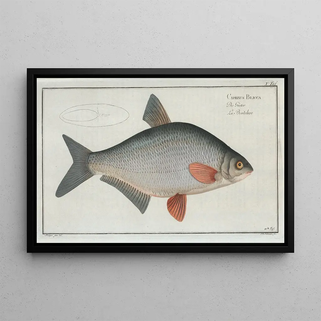 Marcus Elieser Bloch, activo en el siglo XVIII, es reconocido como uno de los pioneros de la impresión artística ictiológica. Su pasión por los peces y la vida acuática lo llevó a crear obras que combinan ciencia y arte. Bloch viajó por Europa, estudiando e ilustrando diversas especies de peces, incluido el Blicca. Su obra principal, "Ichthyologie", marcó un cambio en la representación de las especies marinas, combinando rigor científico y estética. Gracias a su trabajo, contribuyó a sensibilizar al público sobre la biodiversidad acuática, convirtiéndose en una figura emblemática de su época.