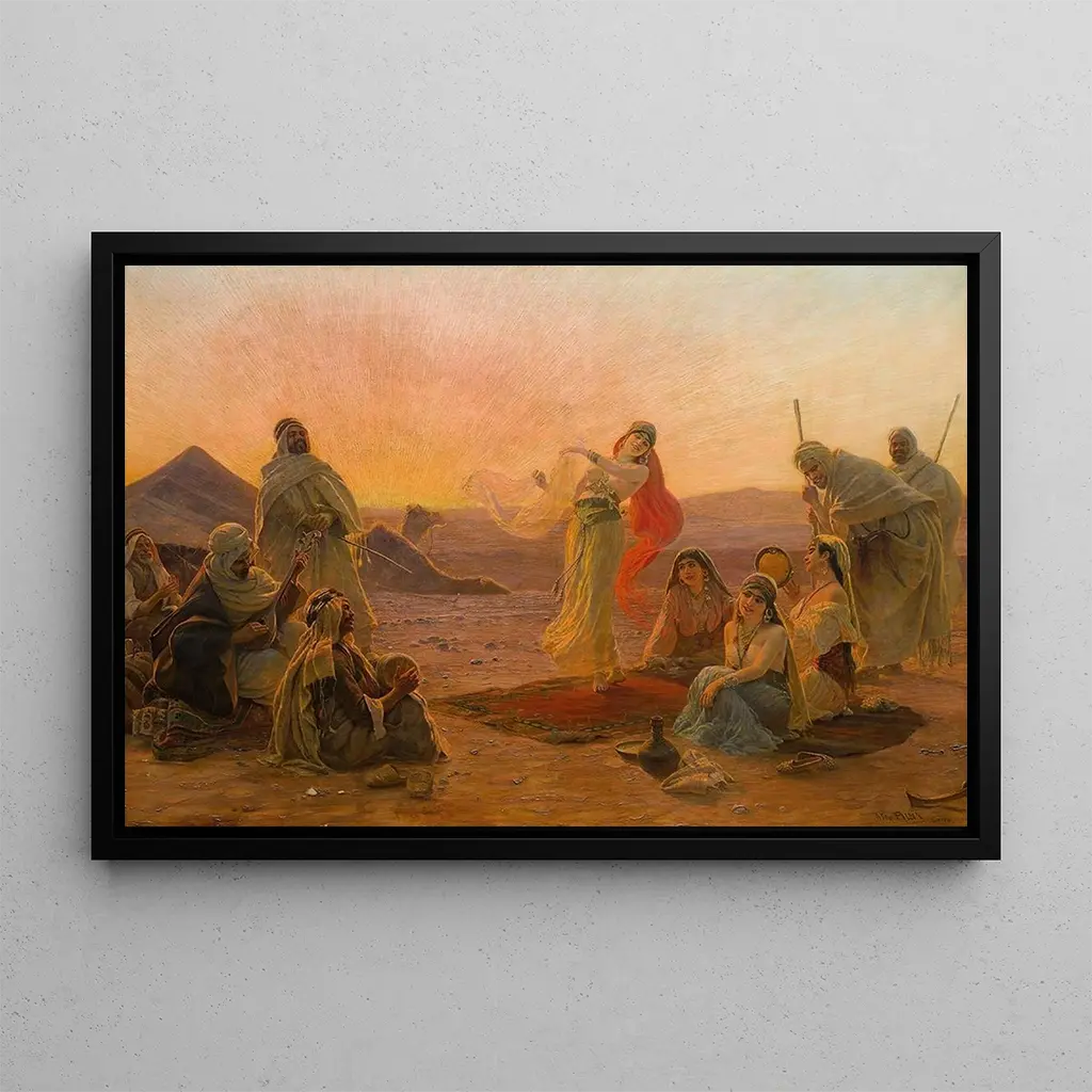 Danse au Coucher du Soleil : un ballet de couleurs et de lumière "Danse au Coucher du Soleil" est une œuvre vibrante qui capture l'essence d'un moment fugace, où la lumière dorée du soleil couchant enveloppe les danseurs dans une atmosphère chaleureuse et festive. Les couleurs éclatantes, allant des oranges profonds aux violets délicats, créent un contraste saisissant qui attire immédiatement le regard. La technique de l'huile sur toile permet à Otto Pilny de jouer avec les ombres et les lumières, donnant vie aux mouvements gracieux des figures en pleine danse. Cette scène évoque une joie de vivre et une célébration de la beauté du moment présent. Otto Pilny : l'artiste de l'exotisme et de l'évasion Otto Pilny, peintre du début du XXe siècle, est célèbre pour ses représentations de scènes orientales et exotiques. Influencé par ses voyages en Orient, Pilny a su intégrer des éléments culturels variés dans ses œuvres, créant ainsi un style unique qui mélange réalisme et imagination. Son travail se distingue par une attention particulière aux détails et une palette de couleurs éclatantes, caractéristiques de son approche artistique. À travers ses tableaux, Pilny invite le spectateur à s'évader vers des contrées lointaines, tout en célébrant la beauté des traditions et des danses. Une acquisition décorative aux multiples atouts La reproduction de "Danse au Coucher du Soleil" est une pièce maîtresse qui enrichira votre décoration intérieure. Que ce soit dans un salon, un bureau ou une chambre, cette toile apportera une touche de dynamisme et de chaleur à votre espace. Sa qualité de reproduction assure une fidélité aux nuances et aux détails de l'œuvre originale, permettant d'apprécier pleinement l'énergie de la scène. Avec son attrait esthétique indéniable, cette œuvre s'intègre parfaitement dans divers styles de décoration, créant ainsi une ambiance accueillante et inspirante.