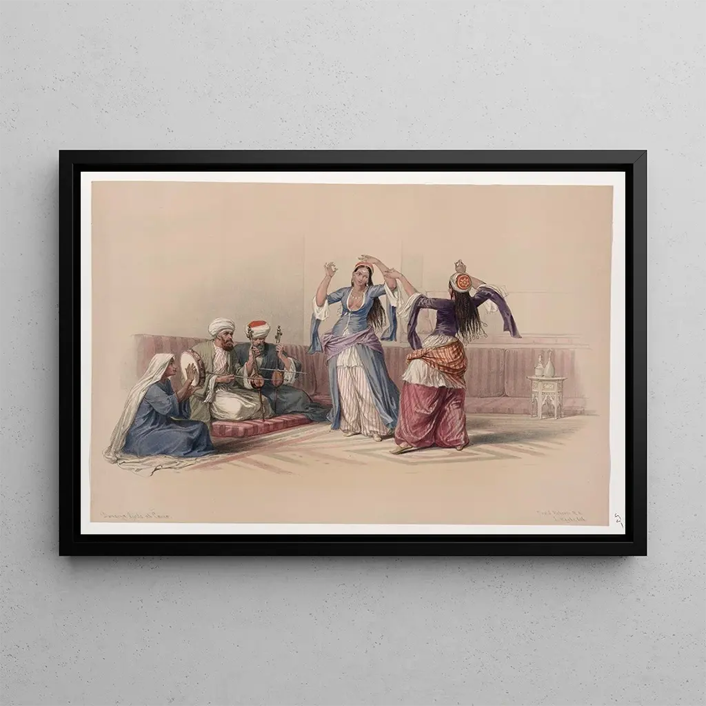 "Danseuses au Caire" de David Roberts est une œuvre qui évoque la beauté et l'élégance des danseuses orientales, capturant un moment de grâce et de mouvement. Les figures féminines, drapées dans des costumes colorés, semblent danser au rythme d'une musique invisible, tandis que l'arrière-plan architectural témoigne de l'exotisme du Caire. La technique de Roberts, mêlant réalisme et romantisme, crée une atmosphère à la fois vivante et rêveuse, transportant le spectateur dans un monde lointain et fascinant.