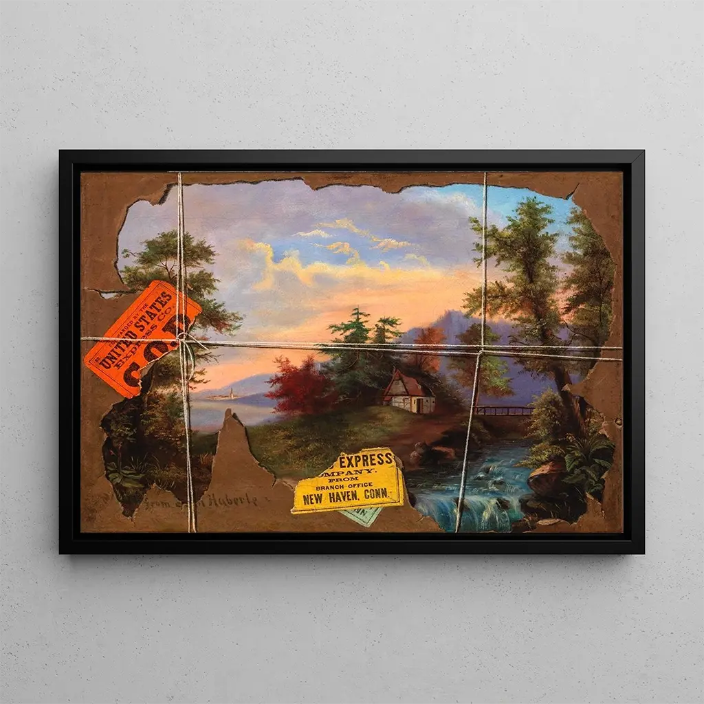 John Haberle, artista estadounidense del siglo XIX, es famoso por sus impresiones artísticas de trompe-l'œil que desafían las percepciones. Influenciado por el realismo y el movimiento impresionista, supo desarrollar un estilo único que combina precisión e ilusión. "Déchiré en transit" demuestra su talento excepcional para reproducir texturas y materiales, jugando con la luz. Su carrera, aunque relativamente corta, dejó una huella duradera en el mundo del arte, convirtiéndolo en un pionero en el campo del trompe-l'œil y en un artista respetado de su época.