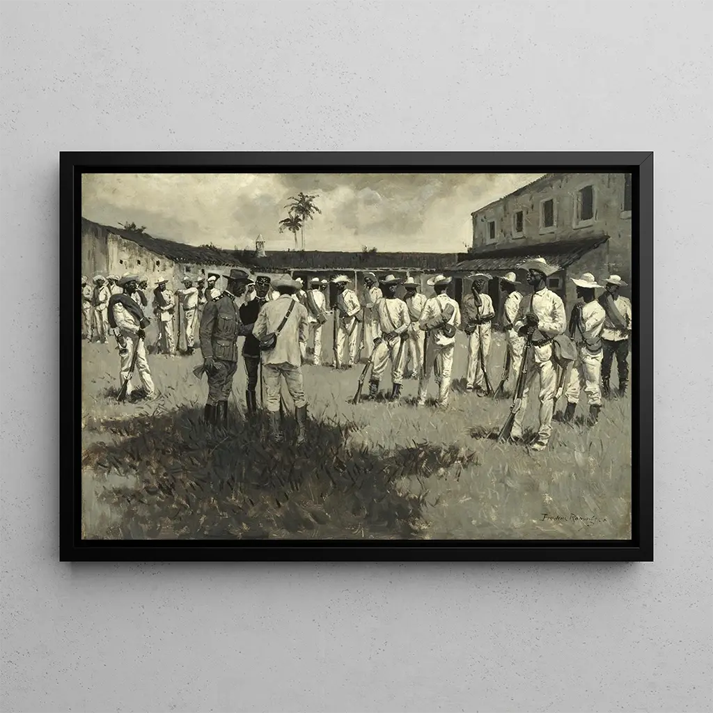 La "impresión artística de la disolución del ejército de Gómez" de Frederic Remington es una obra que captura un momento dramático de la historia estadounidense. En este cuadro, los colores oscuros y terrosos evocan un sentimiento de desesperación, mientras que las figuras de los soldados, congeladas en poses de fatiga y resignación, testimonian la dura realidad de la guerra. La técnica de Remington, que combina hábilmente el realismo con un toque de expresionismo, da vida a esta escena conmovedora, donde la sombra de la derrota planea sobre los personajes. Cada detalle, desde las expresiones faciales hasta los movimientos de los caballos, está cuidadosamente representado, creando una atmósfera de tensión palpable.