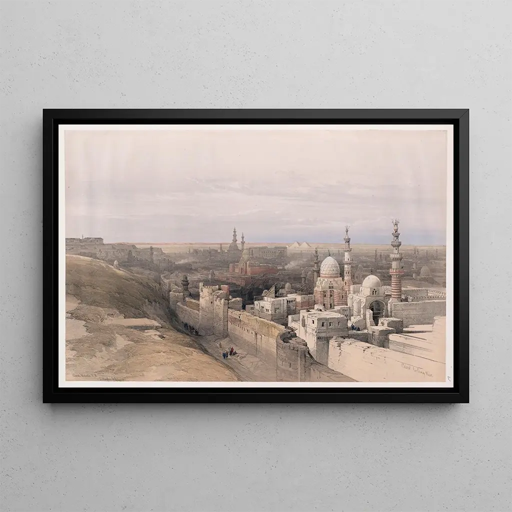 La impresión artística "El Cairo visto desde el oeste" de David Roberts nos transporta instantáneamente al corazón de Egipto en el siglo XIX. Esta obra, realizada con acuarela, se distingue por sus colores cálidos y vibrantes, que evocan la luz dorada del sol naciente sobre los edificios históricos de la ciudad. La composición, rica en detalles, presenta minaretes elevados y casas con techos planos, creando una atmósfera a la vez pacífica y dinámica. El artista logra capturar la esencia de la vida cotidiana en El Cairo, invitando al espectador a contemplar esta escena animada donde el Oriente se revela en toda su esplendor.