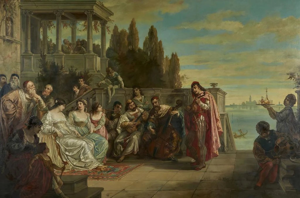 Augusto Wolf, pintor del siglo XIX, es conocido por sus representaciones de la vida veneciana, combinando realismo y romanticismo. Su obra se inscribe en un período donde el artista busca capturar la esencia de las tradiciones locales mientras explora los temas de la fiesta y la convivialidad. Influenciado por los colores vibrantes y las luces de Venecia, Wolf logra crear cuadros que celebran la cultura italiana. Su trabajo es un homenaje a la belleza y a la riqueza de las tradiciones, convirtiéndolo en un artista imprescindible de su época.