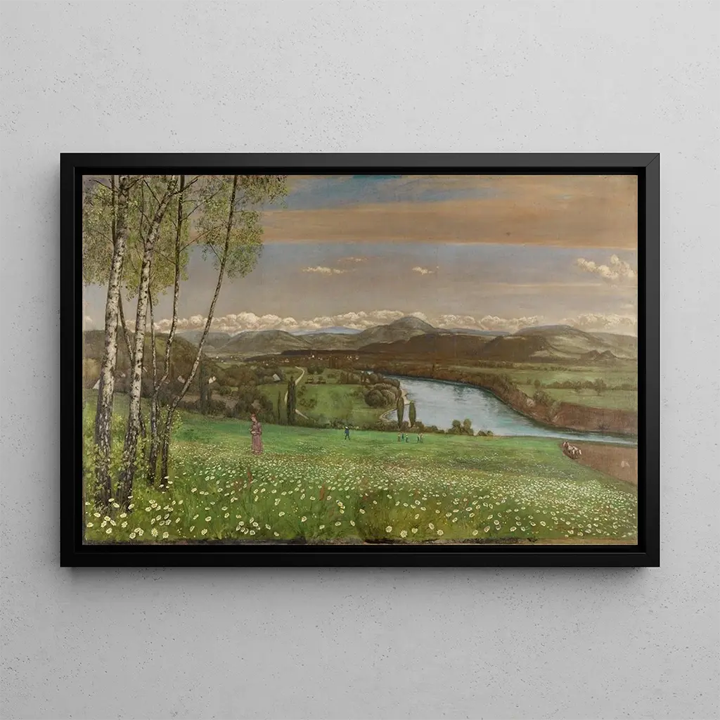 La Vallée du Rhin près de Säckingen, obra emblemática de Hans Thoma, evoca una atmósfera tranquila y bucólica. Las tonalidades de verde y azul se mezclan armoniosamente, creando un paisaje donde la naturaleza florece. La técnica de la pintura al óleo permite capturar la luz de una manera delicada, mientras que los detalles minuciosos de los árboles y las colinas invitan a una contemplación prolongada. Este cuadro, con sus cielos despejados y sus reflejos en el agua, transporta al espectador a un momento de tranquilidad, lejos del tumulto de la vida moderna.
