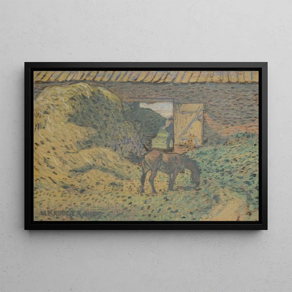 La impresión artística En el granero nos transporta a un paisaje rural, donde la luz dorada del sol se filtra a través de las vigas de madera. Este lienzo evoca la sencillez de la vida en el campo, con personajes involucrados en actividades cotidianas. Los colores cálidos y terrosos, combinados con toques de verde, crean una atmósfera tranquilizadora y reconfortante. El artista logra capturar la esencia de un momento suspendido en el tiempo, invitando al espectador a sumergirse en esta escena llena de serenidad.