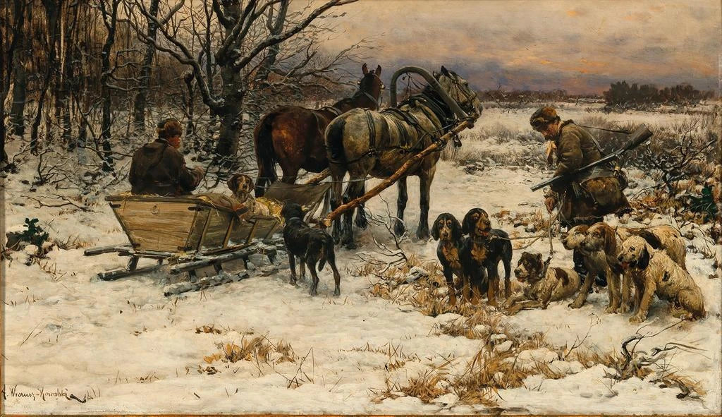La obra "En camino a la caza de invierno" de Alfred von Wierusz-Kowalski transporta al espectador a un paisaje invernal lleno de misterio y aventura. La composición dinámica destaca a cazadores en plena acción, sus siluetas recortadas sobre un fondo de nieve inmaculada. Los tonos fríos de la obra, dominados por blancos brillantes y matices de azul, evocan la dureza del invierno. La técnica del artista, combinando realismo y romanticismo, crea una atmósfera a la vez épica y contemplativa, invitando a sentir la belleza austera de la naturaleza.
