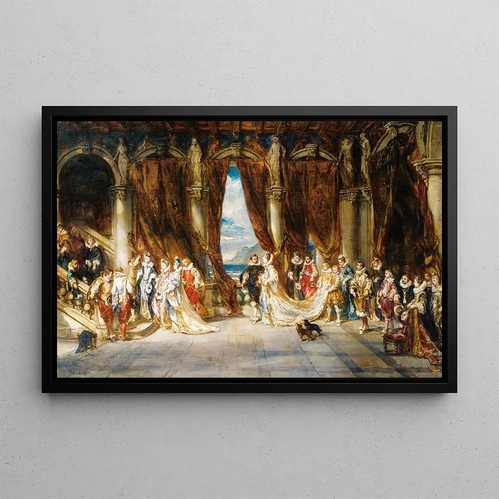 En esta impresión artística de Escena de baile, Eugène Isabey captura la esencia de una velada social donde la gracia y la ligereza se combinan con una atmósfera vibrante. Los personajes, vestidos con trajes suntuosos, parecen flotar en la pista de baile, mientras que los colores vibrantes y los detalles refinados crean un ambiente festivo. La técnica de la acuarela, utilizada con maestría, da vida a cada movimiento, cada sonrisa, e invita al espectador a sumergirse en esta escena viva. El brillo de las luces y la suavidad de los tonos evocan un momento suspendido en el tiempo, una celebración de la belleza y del arte de vivir.