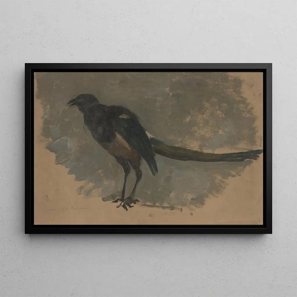 L'œuvre "Étude d'une pie" d'August Allebé se distingue par sa représentation minutieuse et réaliste de cet oiseau. Les couleurs vives et les nuances délicates de noir et blanc capturent la lumière de manière magistrale, créant une atmosphère à la fois vivante et sereine. La composition met en avant la pie dans un cadre naturel, où chaque plume semble vibrer sous le regard attentif de l'artiste. La technique de l'huile sur toile permet une profondeur et une texture qui rendent cette reproduction particulièrement attrayante pour les amateurs d'art et de nature.