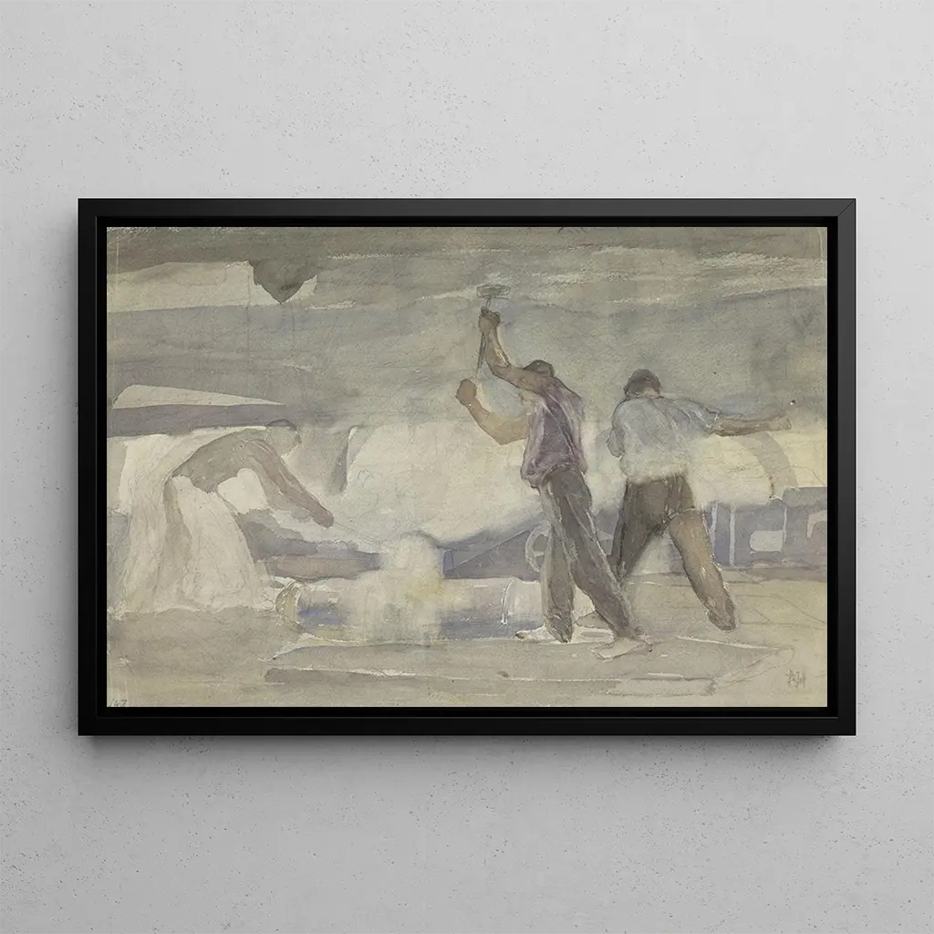 En esta impresión artística de Forge, Pieter Josselin de Jong nos sumerge en un universo de trabajo arduo, donde la luz juega con las sombras de los herreros. Los colores cálidos, dominados por matices de rojo y naranja, evocan el calor del fuego y la energía del esfuerzo humano. La técnica del artista, que combina realismo y toques impresionistas, crea una atmósfera vibrante y dinámica, casi palpable. Cada detalle, desde el respiro de la forja hasta los rostros concentrados de los obreros, narra una historia de pasión y dedicación, invitando al espectador a sentir la intensidad de este momento congelado en el tiempo.