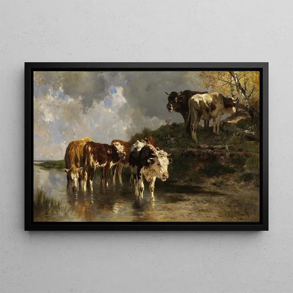 En esta impresión artística de Bétail à l'abreuvoir, Anton Braith nos sumerge en el corazón de una atmósfera tranquila y rural. Los tonos suaves y naturales, que van desde verdes vibrantes hasta marrones cálidos, evocan una armonía perfecta entre los animales y su entorno. La técnica del artista, que combina hábilmente el realismo con un toque impresionista, permite sentir la frescura del agua y la tranquilidad del paisaje. Cada detalle, desde los reflejos en la superficie del agua hasta las sombras de los árboles, contribuye a crear una escena viva e inmersiva, invitando al espectador a detenerse y contemplar este momento de vida simple pero valioso.