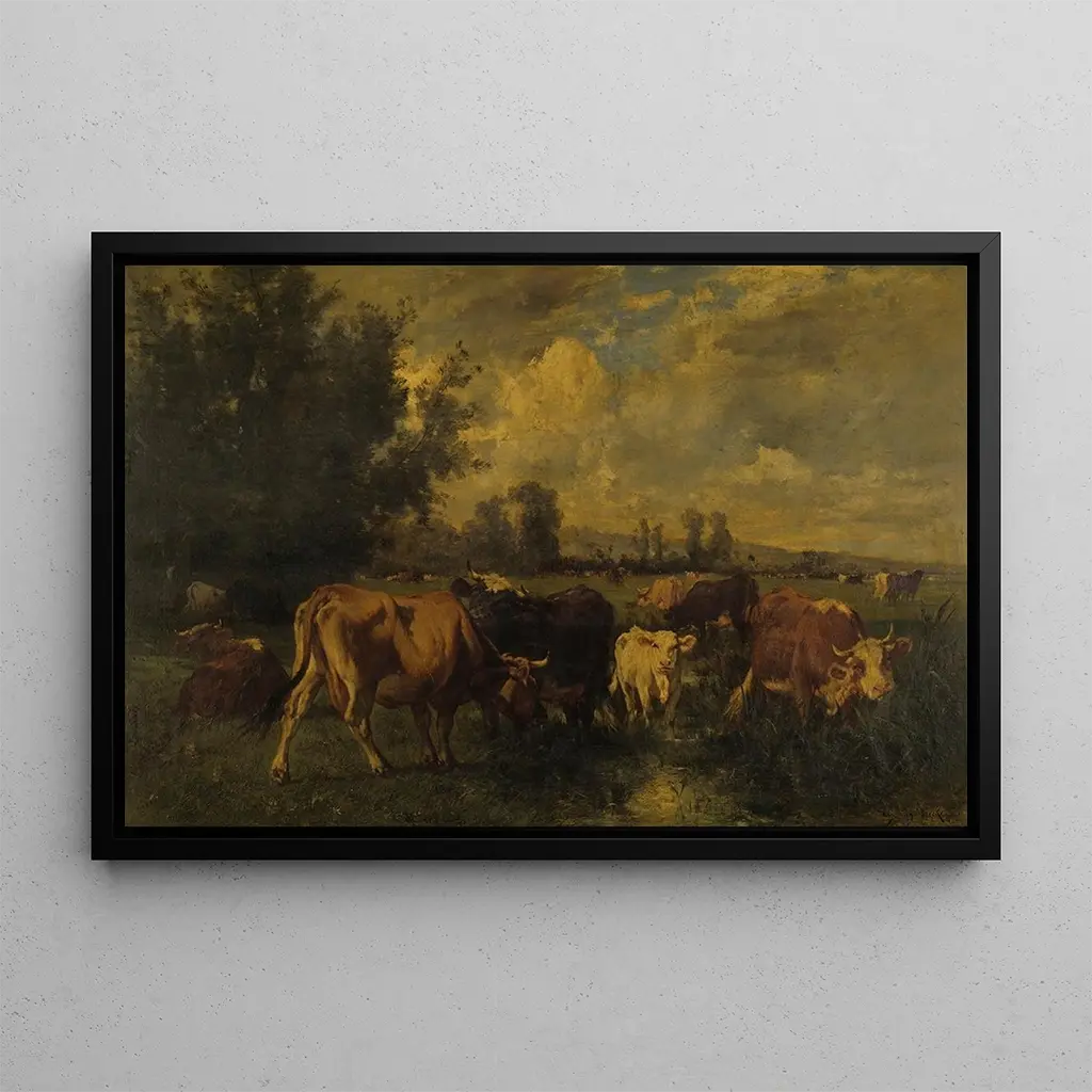 Émile van Marcke, nacido en 1827, es un artista francés reconocido por sus representaciones de la vida rural y de los animales. Influenciado por el realismo y el naturalismo, supo capturar la esencia de la campiña francesa a través de sus obras. Van Marcke a menudo pintaba escenas de ganado, destacando la belleza y la dignidad de los animales en su entorno natural. Su trabajo jugó un papel importante en la representación de la vida agrícola en el siglo XIX, y Bétail dans un champ es un ejemplo perfecto de su talento para inmortalizar momentos simples pero significativos.