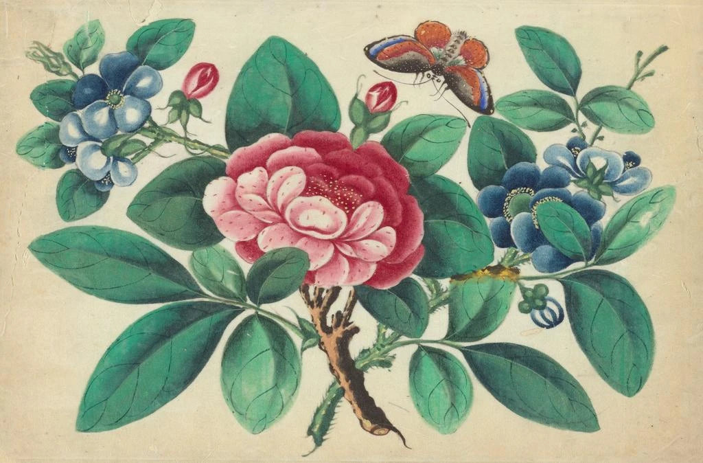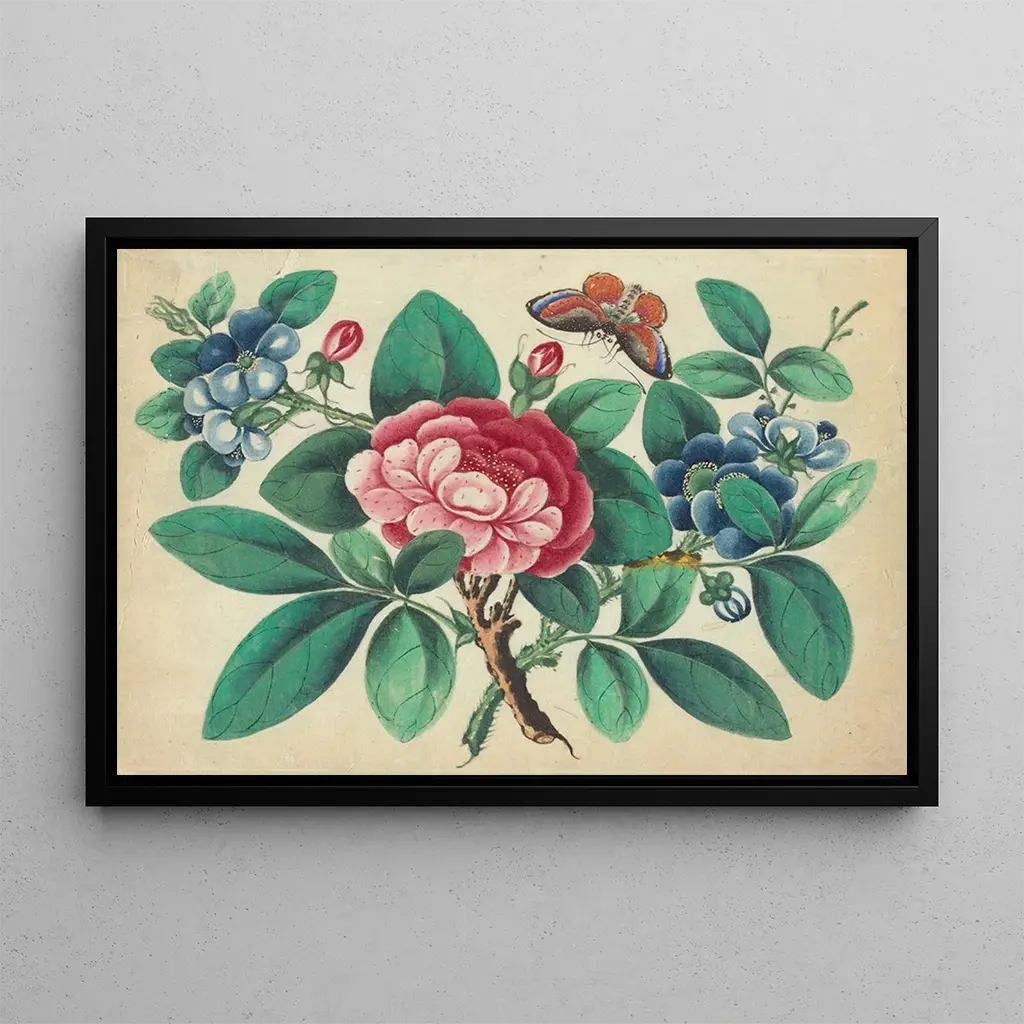 Gran Flor Roja, Flores Azules, Mariposa - Anónimo