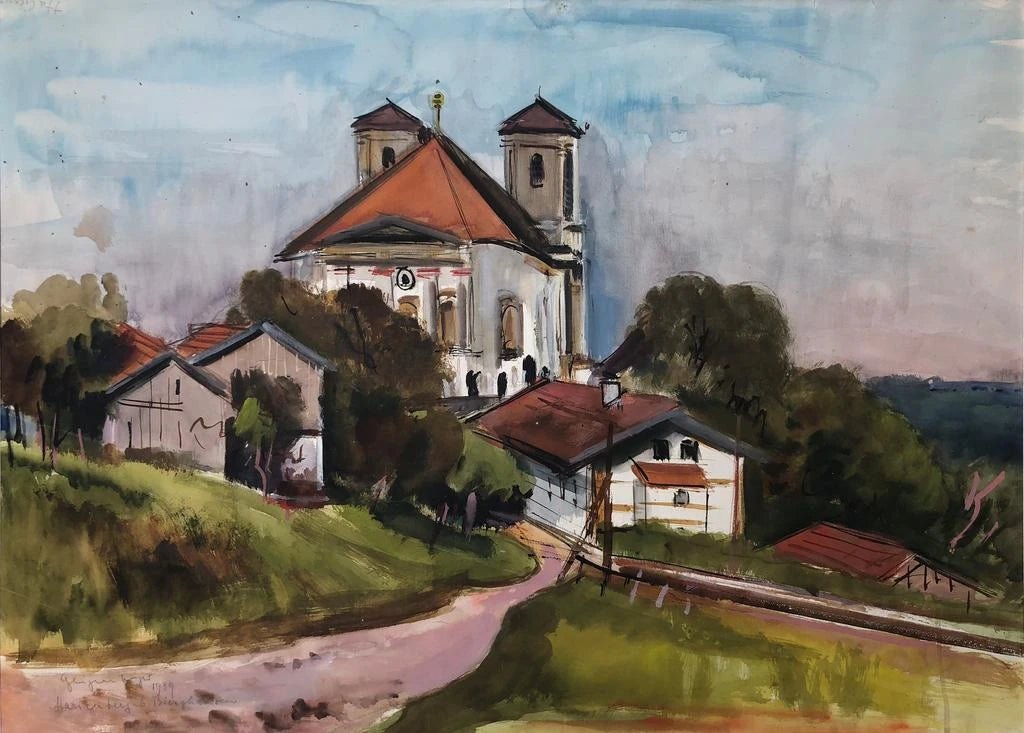 Otto Geigenberger, pintor activo a principios del siglo XX, es conocido por sus representaciones de edificios religiosos y paisajes. Su estilo, influenciado por el realismo y el romanticismo, destaca la majestuosidad de las estructuras barrocas y su integración en el paisaje. Geigenberger dedicó una parte de su carrera a inmortalizar lugares de culto, testimoniando la importancia de la espiritualidad en la vida cotidiana. Sus obras, aunque menos famosas, son esenciales para comprender la evolución del arte sacro en Alemania.