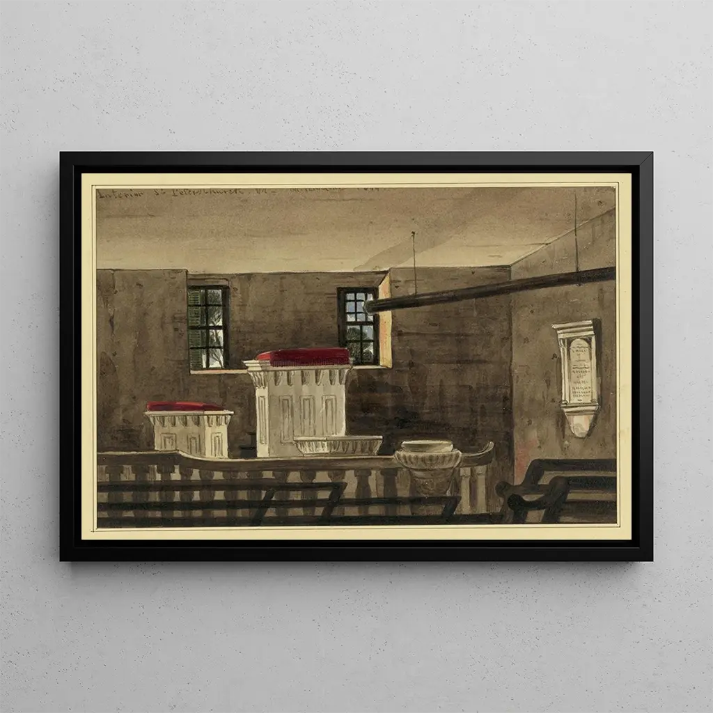 La obra "Interior de la iglesia de San Pedro" de William McIlvaine nos transporta al corazón de un espacio sagrado, donde la luz desempeña un papel primordial. Los colores cálidos y dorados se mezclan armoniosamente con las sombras, creando una atmósfera de serenidad y recogimiento. La técnica de McIlvaine, que combina precisión y sensibilidad, permite sentir la grandeza de la arquitectura mientras resalta los detalles delicados de los ornamentos. Cada pincelada parece capturar la esencia misma de este edificio emblemático, invitando al espectador a una contemplación meditativa.