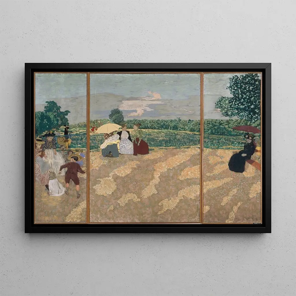 Édouard Vuillard, activo a finales del siglo XIX y principios del XX, es uno de los principales representantes del movimiento nabi, que promovía un enfoque más personal y simbólico del arte. Influenciado por los impresionistas y las artes decorativas, Vuillard supo desarrollar un estilo único, caracterizado por composiciones íntimas y colores vibrantes. Sus obras, a menudo centradas en la vida doméstica y escenas de la vida cotidiana, revelan una sensibilidad particular hacia el entorno y las interacciones humanas. Jardines públicos es un ejemplo perfecto de su talento para capturar la esencia de los momentos fugaces.