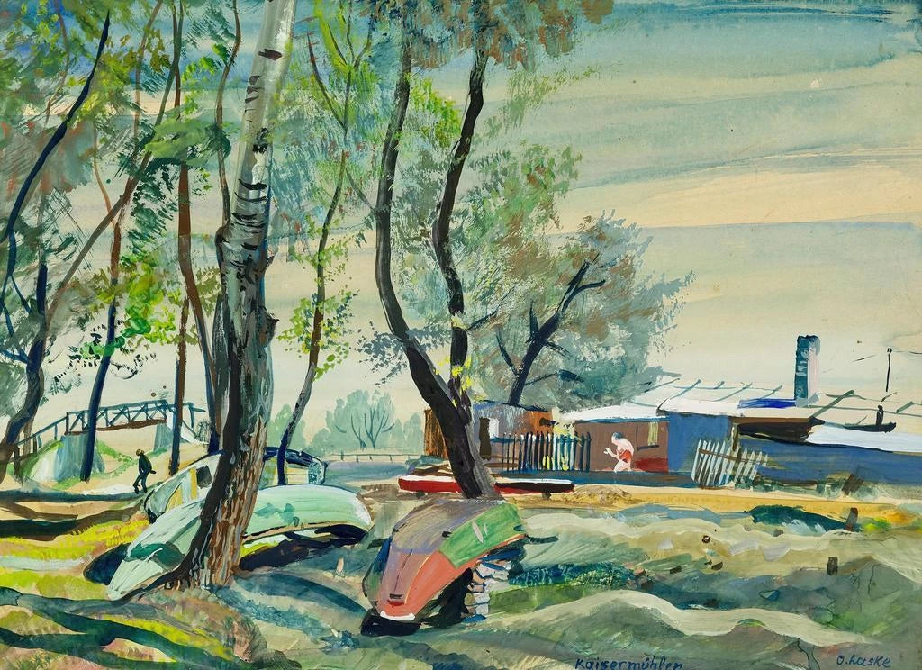 Kaisermühlen, obra emblemática de Oskar Laske, nos sumerge en una atmósfera tranquila donde la urbanidad se combina con la naturaleza. La composición, rica en detalles, nos presenta un paisaje urbano bañado por una luz suave, donde los edificios se reflejan en las aguas tranquilas de un canal. Los colores pastel, dominados por matices de azul y verde, crean una armonía visual relajante. La técnica de Laske, que combina impresiónismo y realismo, permite sentir la tranquilidad de este lugar, invitando al espectador a perderse en él y contemplar la belleza de lo cotidiano.