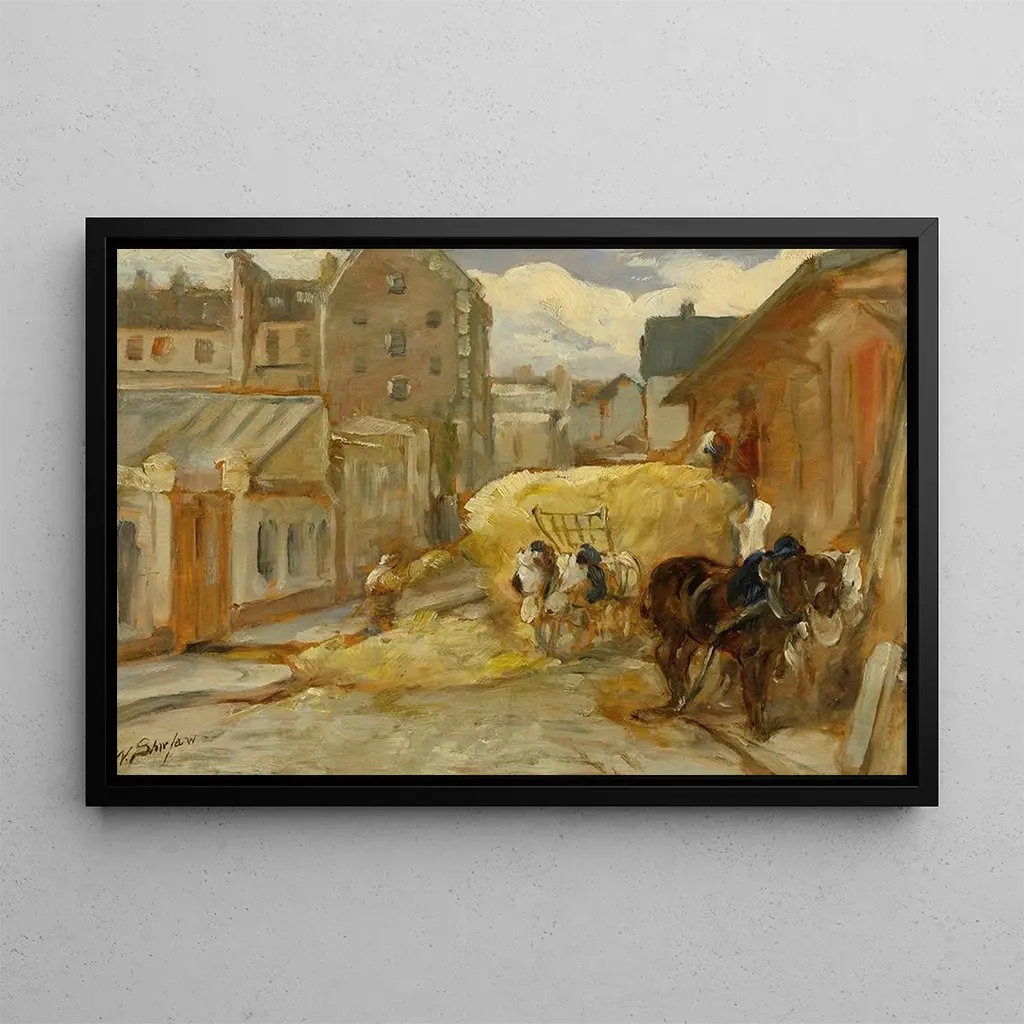 Walter Shirlaw, peintre d'origine écossaise, a su capturer l'essence des paysages américains au XIXe siècle. Influencé par les grands maîtres européens, il a développé un style unique qui allie réalisme et impressionnisme. Shirlaw a été un membre actif de la scène artistique de son époque, participant à de nombreuses expositions et contribuant à la reconnaissance du paysage américain. Son œuvre, La Charrette de foin, illustre parfaitement son talent pour représenter la beauté de la nature et la vie rurale, tout en témoignant de l'évolution artistique qui marquait son époque.