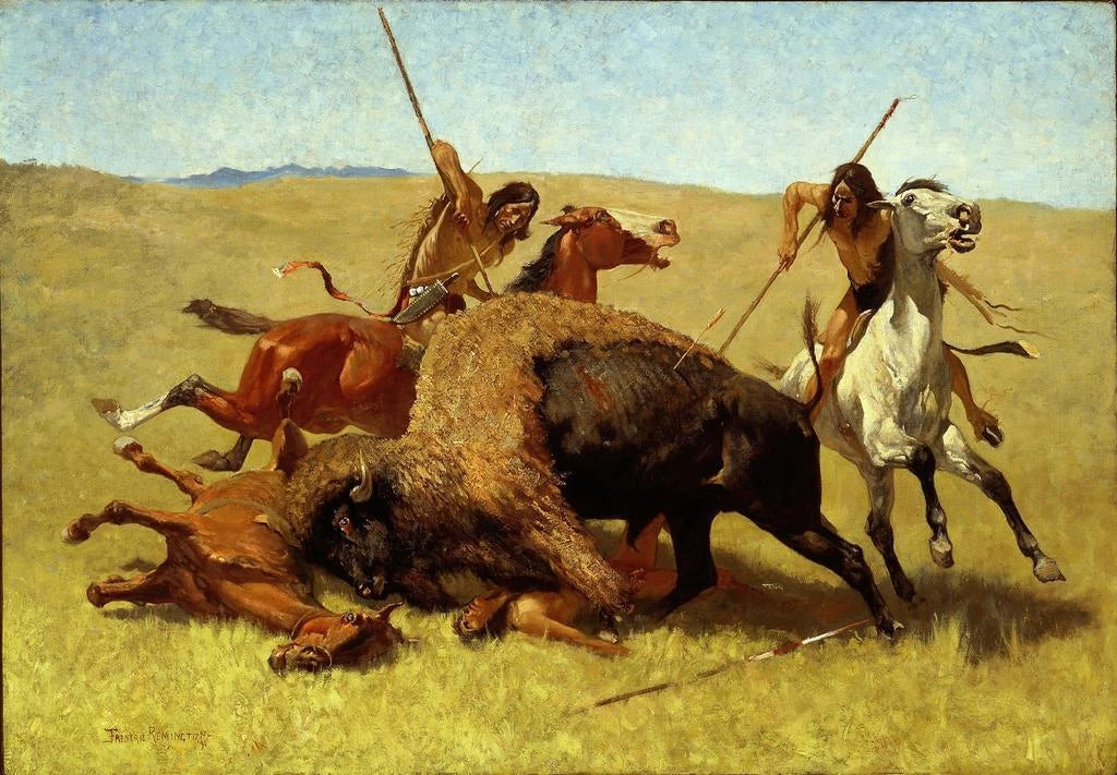 Frederic Remington, actif à la fin du XIXe siècle, est célèbre pour ses représentations de la vie dans l'Ouest américain. Influencé par ses voyages et ses rencontres avec les peuples autochtones, il a su capturer la culture, la faune et la flore de cette région. Son style, alliant réalisme et romantisme, a façonné l'image que l'on a aujourd'hui de l'Ouest sauvage. "La chasse au bison" est l'une de ses œuvres emblématiques, illustrant son engagement à immortaliser les scènes de la vie frontalière et à rendre hommage à la majesté de la nature.