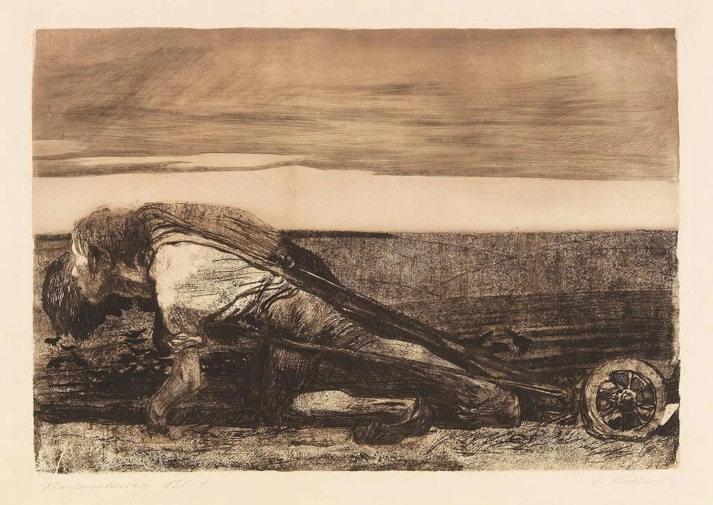Käthe Kollwitz, artista alemana de principios del siglo XX, es reconocida por su compromiso social y su humanismo. Influenciada por los eventos trágicos de su época, especialmente las guerras y las desigualdades sociales, dedicó su carrera a representar el sufrimiento humano y la lucha por la justicia. Les Charrues, creada en un contexto de cambios sociales, ilustra perfectamente su deseo de dar voz a los oprimidos. Su estilo, que combina expresionismo y realismo, dejó una huella indeleble en la historia del arte, convirtiéndola en una figura imprescindible del movimiento artístico comprometido.