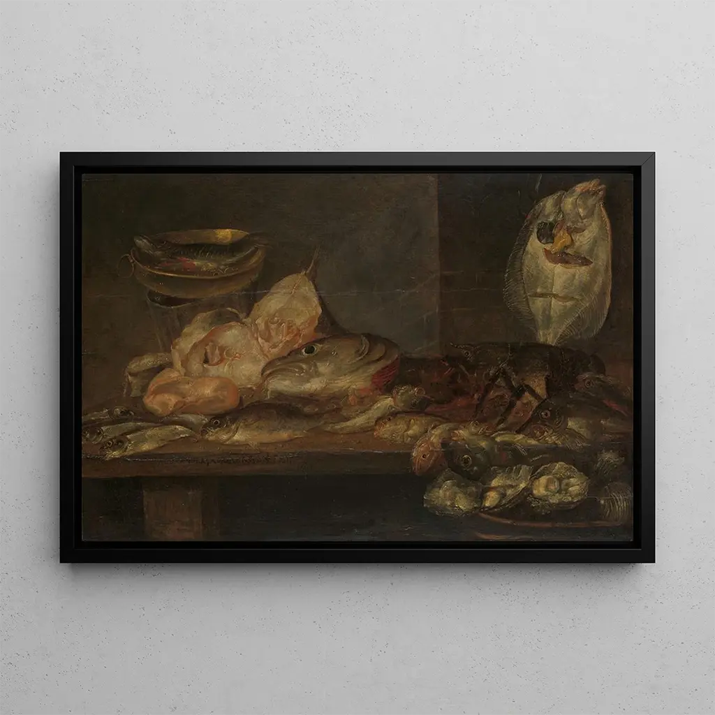 La impresión artística de la naturaleza muerta con pez de Alexander Adriaenssen evoca un mundo de delicadeza y refinamiento. Los tonos vibrantes de los peces, las frutas y los objetos de vidrio se mezclan armoniosamente, creando una composición visual cautivadora. La técnica del claroscuro, característica del artista, resalta los reflejos y las sombras, confiriendo a la obra una atmósfera casi viva. Cada elemento parece contar una historia, invitando al espectador a sumergirse en esta escena de la vida cotidiana, donde la naturaleza y el arte se encuentran con elegancia.