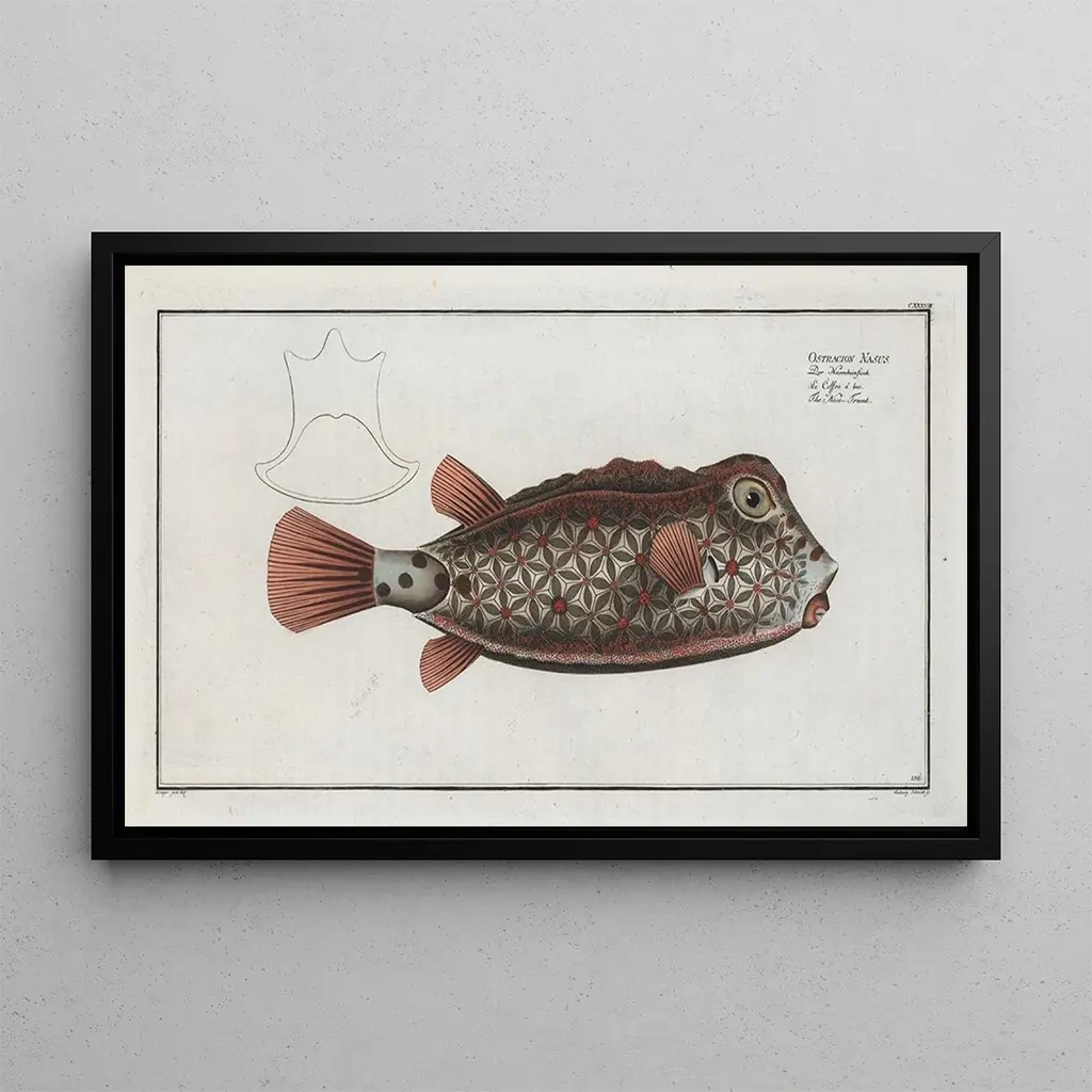 La obra "Ostracion Nasus Le Poisson-Tronc" de Marcus Elieser Bloch nos sumerge en el fascinante universo de los océanos. Este cuadro, rico en detalles, destaca la belleza singular de este pez con formas geométricas y colores vibrantes. Los tonos vivos de azul, amarillo y verde se combinan armoniosamente, creando una atmósfera a la vez vibrante y relajante. La técnica de la grabado, ejecutada con minuciosidad, permite representar cada escama con una precisión notable, invitando al espectador a admirar la complejidad de la naturaleza. Esta impresión artística es una verdadera oda a la biodiversidad marina.