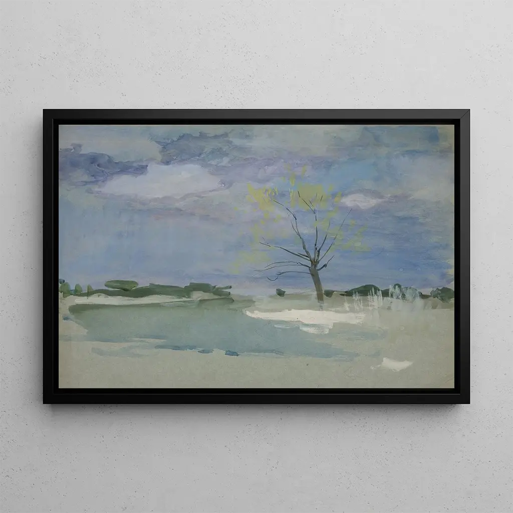 En esta impresión artística de Paisaje con árbol, Edwin Austin Abbey nos transporta a un mundo donde la naturaleza florece con gracia. Los tonos suaves de verde y azul se mezclan con toques de luz dorada, creando una atmósfera pacífica y contemplativa. La composición está cuidadosamente equilibrada, con un árbol majestuoso que se eleva en el centro, rodeado de un paisaje bucólico. La técnica del artista, caracterizada por pinceladas delicadas, da vida a cada hoja y cada brizna de hierba, invitando al espectador a sumergirse en esta escena idílica.