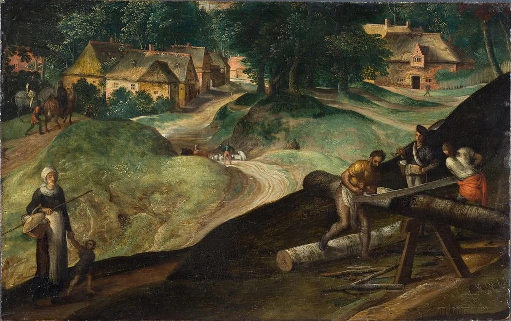 Paisaje con hombres serrando madera - Gillis Mostaert