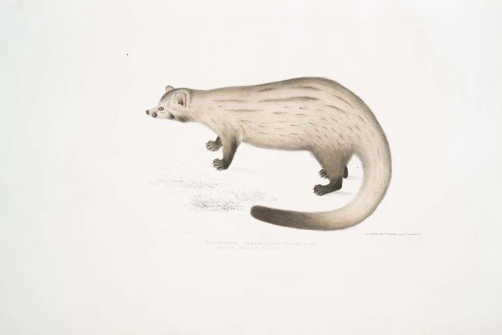 John Edward Gray, naturalista y zoólogo británico del siglo XIX, marcó su época con sus contribuciones a la clasificación de especies. Influenciado por las exploraciones de su tiempo, supo capturar la diversidad animal con una precisión científica y un sentido artístico indudable. Gray colaboró con numerosos exploradores y científicos, lo que le permitió acceder a especímenes raros y enriquecer sus conocimientos. Su trabajo fue fundamental para la comprensión de la fauna, y sus ilustraciones, como la del Paradoxure Bondar, testimonian su talento excepcional y su compromiso con la ciencia.