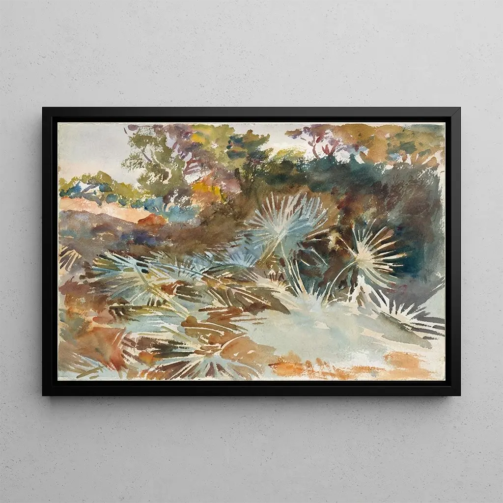 Dans "Paysage avec palmiers", John Singer Sargent nous transporte dans un monde de sérénité et de beauté naturelle. Cette toile évoque des paysages luxuriants, où les palmiers se dressent majestueusement sous un ciel azur. Les nuances de vert et de bleu, associées à une lumière douce, créent une atmosphère paisible et rêveuse. Sargent, maître de la lumière et des textures, parvient à capturer la délicatesse des feuillages et la chaleur du soleil, offrant ainsi une véritable invitation à l'évasion.