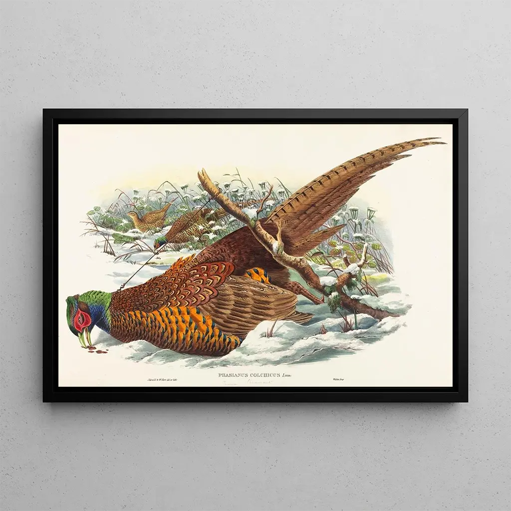 La reproduction de Phasianus colchicus, œuvre emblématique de John Gould, évoque la splendeur de la faune aviaire. Dans ce tableau, les couleurs vibrantes des plumes du faisan se mêlent harmonieusement à un arrière-plan délicat, créant une atmosphère à la fois vivante et sereine. Gould, maître de l'illustration ornithologique, utilise des techniques de gravure et d'aquarelle pour capturer chaque détail avec une précision remarquable. L'œuvre invite à une contemplation attentive, où chaque nuance de couleur et chaque trait de plume semblent prendre vie, transportant le spectateur dans un monde naturel riche et fascinant.
