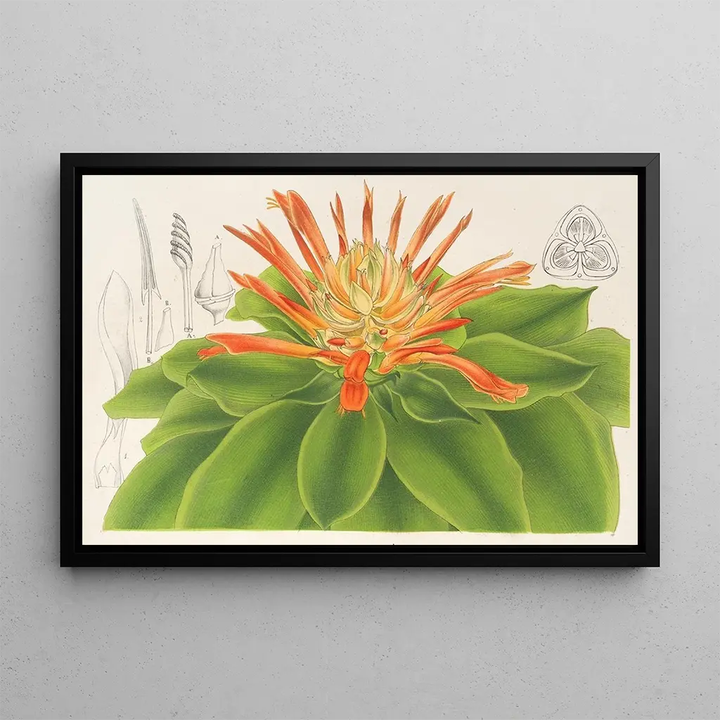 La impresión artística de Pitcairnia tabuliformis nos sumerge en un universo vibrante donde la naturaleza se expresa con una intensidad asombrosa. Los tonos brillantes de verde, rojo y amarillo se combinan armoniosamente, creando una atmósfera cálida y revitalizante. La técnica del artista, que juega con la luz y la sombra, acentúa el relieve de las hojas y las flores, dando vida a esta obra botánica. Cada detalle está cuidadosamente representado, invitando al espectador a admirar la belleza de las formas y los colores que componen esta escena tropical.
