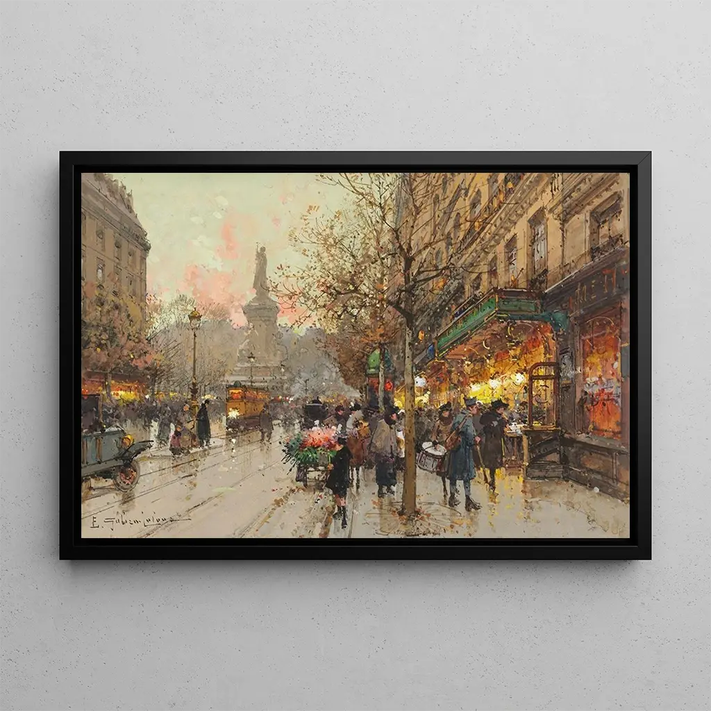 La reproduction de Place de la République d'Eugène Galien-Laloue capture l'effervescence d'un moment de vie dans le Paris du début du XXe siècle. Les couleurs chaudes et lumineuses évoquent une atmosphère joyeuse, où les passants se mêlent aux ombres des arbres. La technique de l'artiste, mêlant aquarelle et huile, donne une texture délicate aux pavés et aux bâtiments, tandis que les détails minutieux des personnages ajoutent une dimension humaine à cette scène urbaine. Chaque coup de pinceau semble raconter une histoire, plongeant le spectateur dans l'animation de ce lieu emblématique.