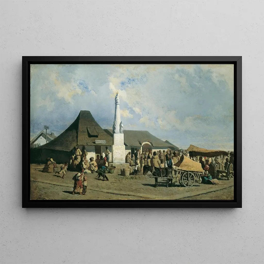 En esta impresión artística de Place du Marché à Szolnok, el artista Johann Gualbert Raffalt captura la esencia de un momento de vida, donde los colores vibrantes y los detalles minuciosos se combinan para crear una atmósfera cálida. Las tonalidades de verde y azul dominan la obra, evocando la frescura de un día soleado, mientras que los toques de rojo y naranja aportan una dinámica viva. La técnica de Raffalt, que combina impresionismo y realismo, permite sentir casi el movimiento de los personajes y la animación del mercado. Cada elemento, desde los puestos de frutas hasta los transeúntes, contribuye a una narración visual rica y envolvente.