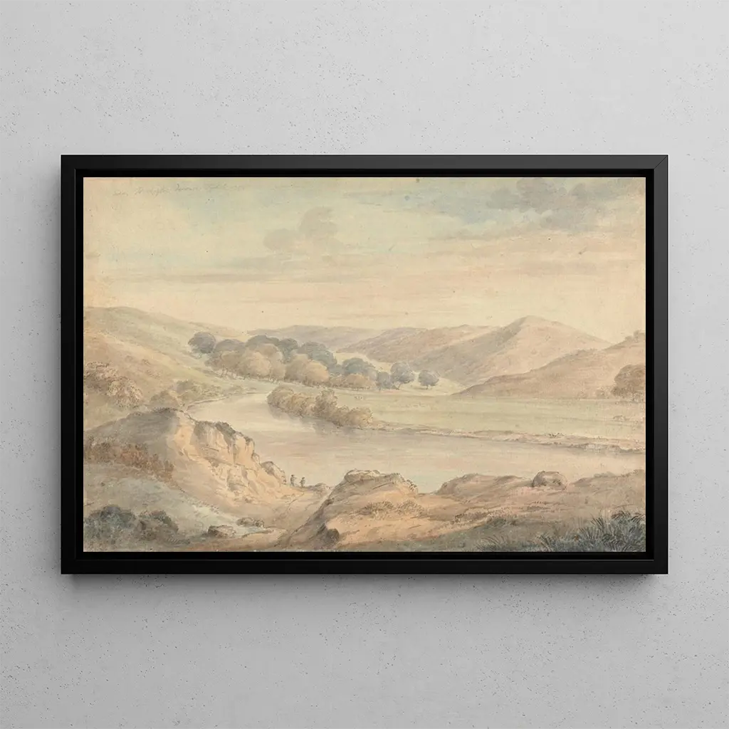 En esta impresión artística de Cerca de Torrington, Devonshire, el Capitán Francis Grose nos transporta al corazón de un paisaje inglés apacible. Los tonos suaves de verde y azul se mezclan armoniosamente, creando una atmósfera de tranquilidad. La técnica de la pintura al óleo permite capturar las delicadas tonalidades de la luz, que se refleja en el agua e ilumina el follaje. La composición, con sus líneas fluidas y sus formas orgánicas, invita a la contemplación, evocando un paseo pacífico por el campo inglés.