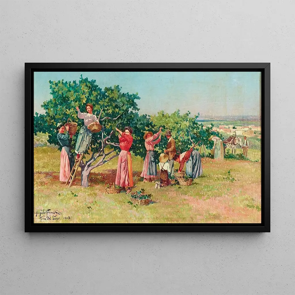 Angiolo Tommasi, peintre italien du début du XXe siècle, est souvent associé au mouvement post-impressionniste. Formé à l'Académie des Beaux-Arts de Florence, il a été influencé par les grands maîtres de son temps, tout en développant un style personnel qui allie réalisme et impressionnisme. Tommasi a consacré une grande partie de sa carrière à représenter la vie rurale et les paysages de la Toscane, témoignant d'une époque où l'art se faisait le reflet des traditions et des modes de vie. Son œuvre "Récolte en Toscane" est emblématique de cette quête de beauté et de vérité.
