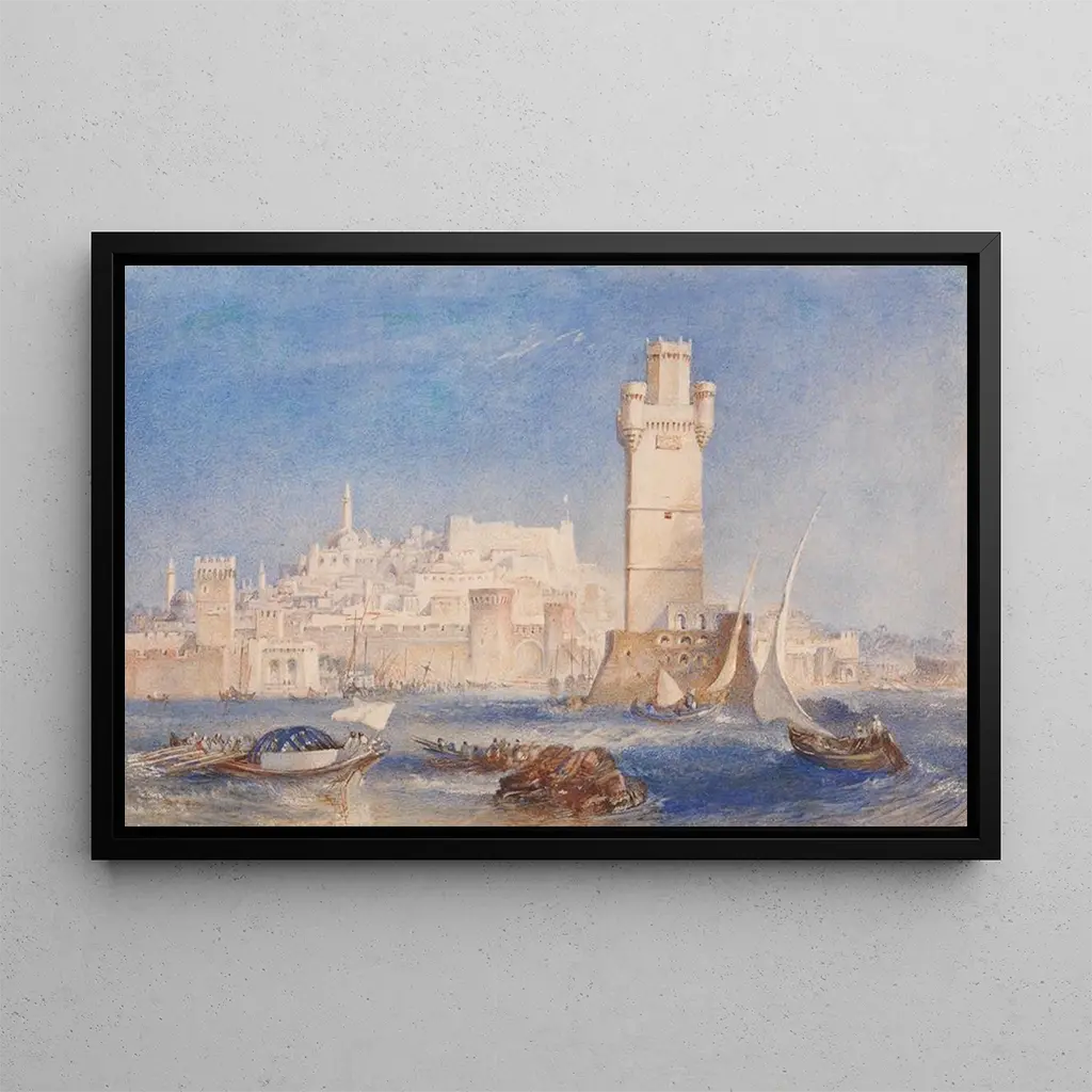 La impresión artística de Rhodes, obra emblemática de Joseph Mallord William Turner, nos transporta hacia costas soleadas y cielos brillantes. Las tonalidades de azul y oro se combinan armoniosamente, creando una atmósfera de ensueño y serenidad. Turner, maestro de la luz, utiliza pinceladas fluidas para capturar el movimiento de las olas y la suavidad del aire. Esta obra transmite una sensación de calma y evasión, invitando al espectador a sumergirse en un mundo donde la naturaleza y el arte se entrelazan.