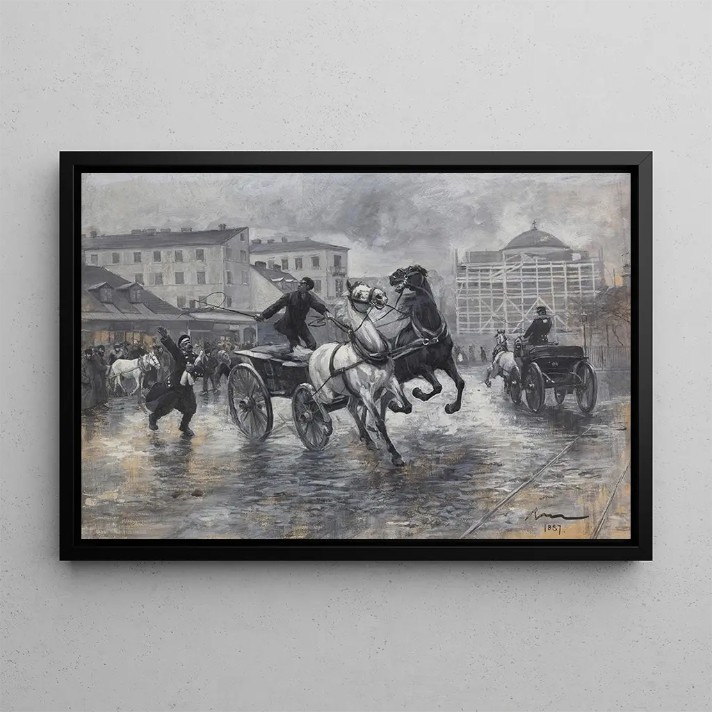 Władysław Podkowiński, actif à la fin du XIXe siècle, est un artiste polonais reconnu pour son rôle dans le mouvement impressionniste en Pologne. Influencé par les grands maîtres européens, il a su développer un style unique qui allie réalisme et expressivité. Sa carrière, bien que tragiquement écourtée, a laissé une empreinte durable sur l'art polonais. Podkowiński a souvent exploré des thèmes de la vie quotidienne, cherchant à capturer des moments fugaces d'émotion et de beauté. Sur la Place à Aleksandra est un exemple parfait de son talent pour immortaliser la vie urbaine avec une sensibilité poignante.